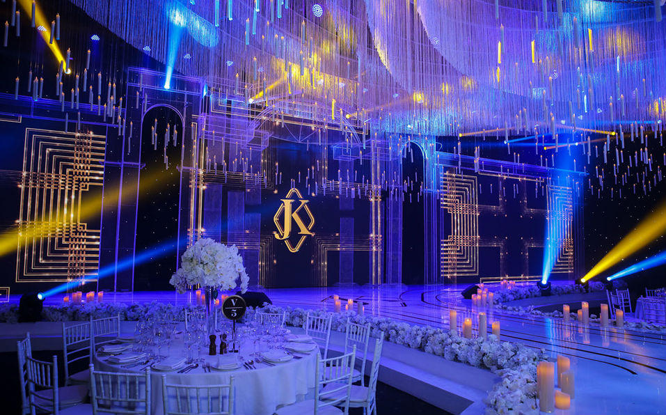 Không gian tiệc cưới được phủ tông trắng, được trang trí bằng hoa hồng và dây pha lê. Riêng sân khấu nổi bật với chùm đèn pha lê khổng lồ. Phía Lan Khuê tiết lộ, trong lễ cưới cô dâu chú rể sẽ có một tiết mục đăc biệt.