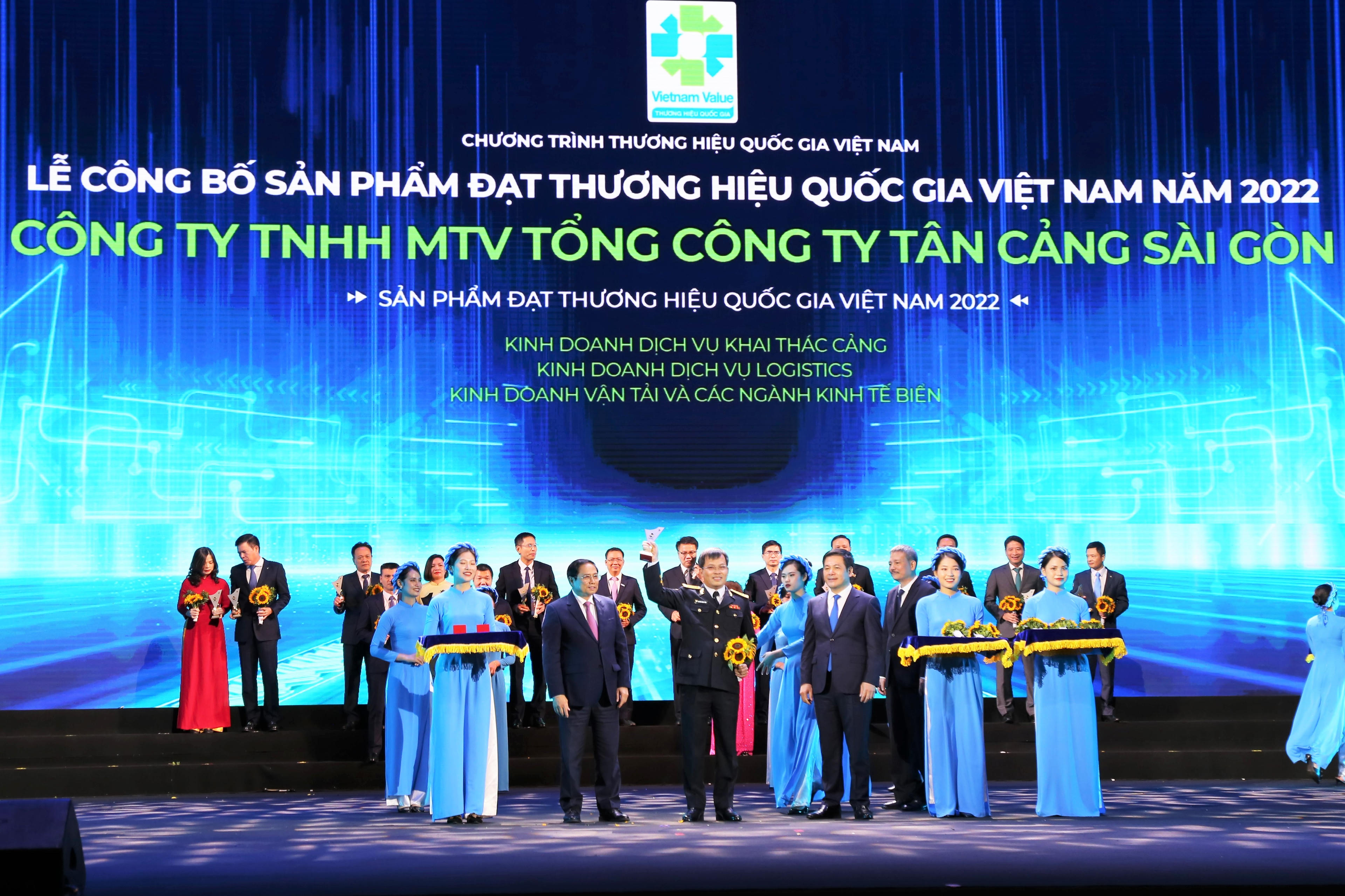 Thủ tướng Chính phủ Phạm Minh Chính dự và trực tiếp trao chứng nhận cho các doanh nghiệp có sản phẩm đạt thương hiệu quốc gia năm 2022. Cùng dự có ông Trần Tuấn Anh - Ủy viên Bộ Chính trị, Trưởng ban Kinh tế Trung ương; ông Nguyễn Hồng Diên - Ủy viên Trung ương Đảng, Bộ trưởng Bộ Công thương, Chủ tịch Hội đồng Thương hiệu Quốc gia Việt Nam. Đại tá Nguyễn Năng Toàn - Bí thư Đảng ủy, Chủ tịch Tổng Công ty Tân Cảng Sài Gòn tham dự và nhận danh hiệu cho Tổng Công ty.