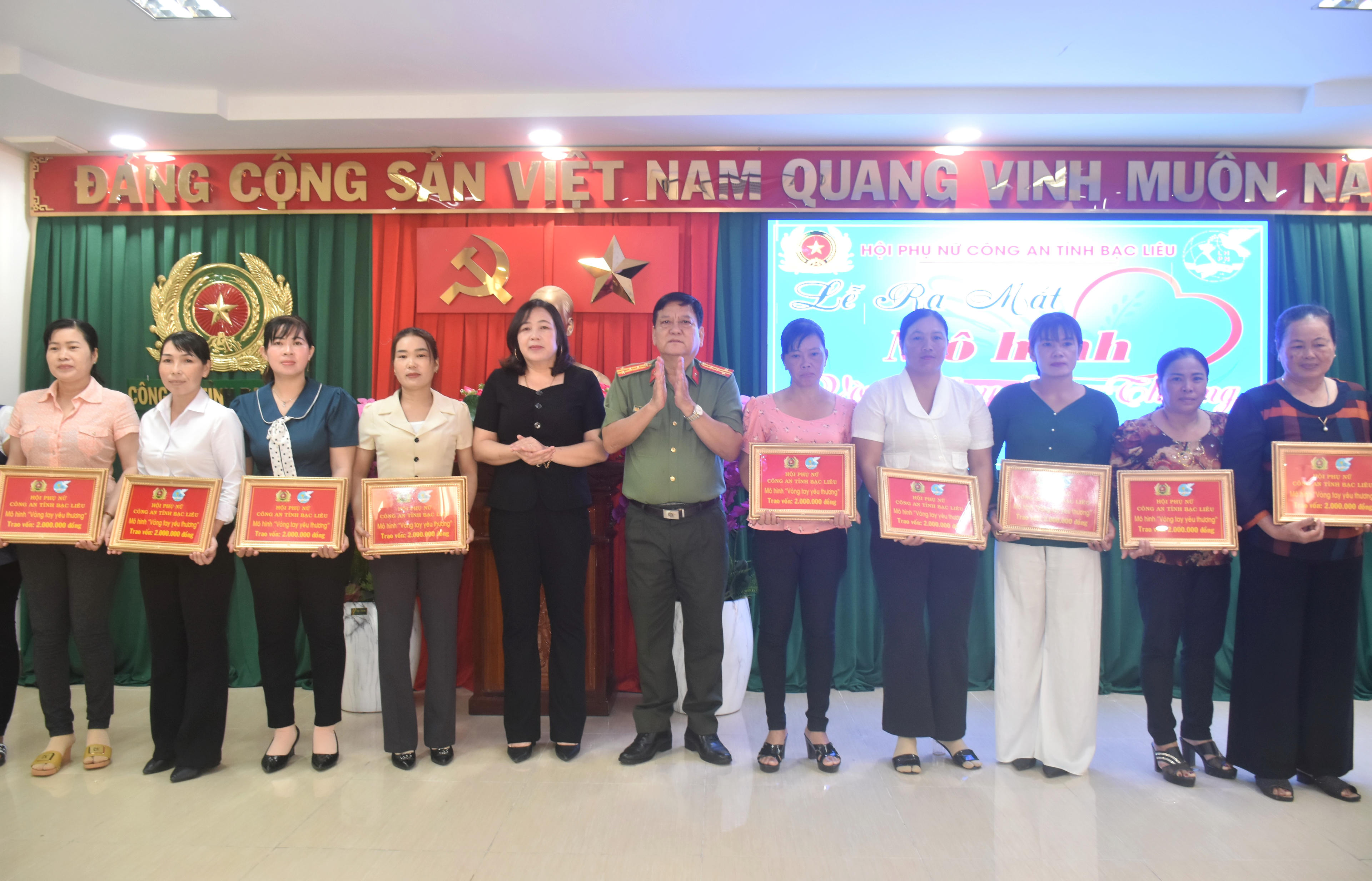 Đại tá Trương Công Dũng - Phó Giám đốc Công an tỉnh Bạc Liêu và đại diện Hội Liên hiệp Phụ nữ tỉnh hỗ trợ vốn cho 10 phụ nữ có hoàn cảnh khó khăn là thành viên Câu lạc bộ “Nữ phòng, chống tội phạm”. |