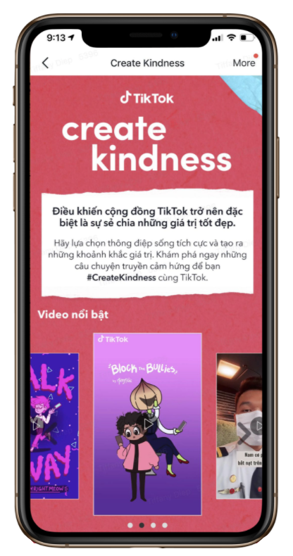 Cùng với đó, tháng 6 năm 2021, một chiến dịch toàn cầu với chuỗi video sáng tạo mang tên #CreateKindness do TikTok phát động nhằm nâng cao nhận thức về nạn bắt nạt trực tuyến và khuyến khích sự tử tế trong cộng đồng. Trong chiến dịch #CreateKindness lần này, TikTok hợp tác với Hội Truyền thông số Việt Nam và Hiệp hội An toàn thông tin Việt Namđể lan tỏa thông điệp này đến tất cả người dùng.