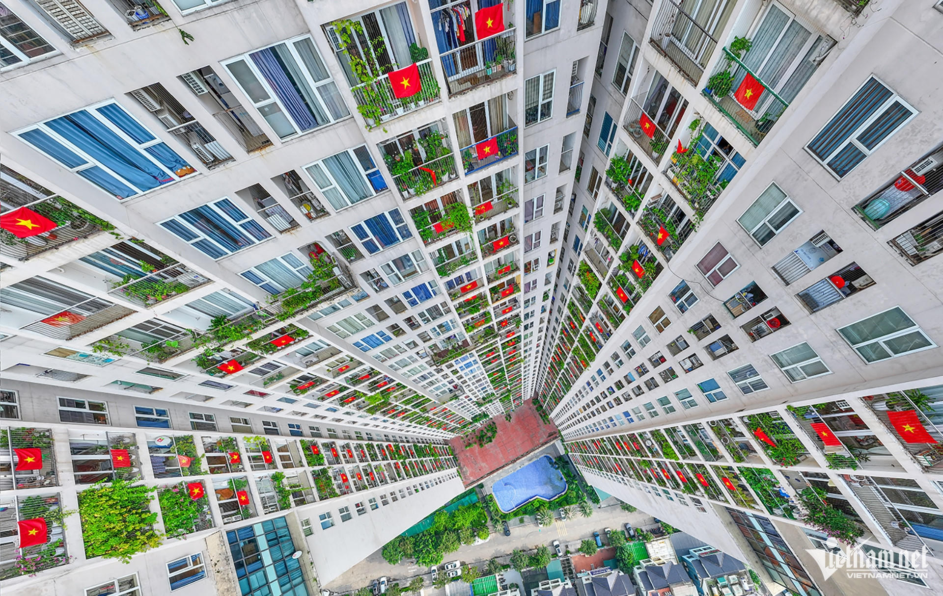 Lá cờ đỏ được treo tại các toà chung cư ở huyện Hoài Đức (Hà Nội) hưởng ứng ngày Quốc khánh đã hơn một tuần nay (Ảnh: Vietnamnet). |