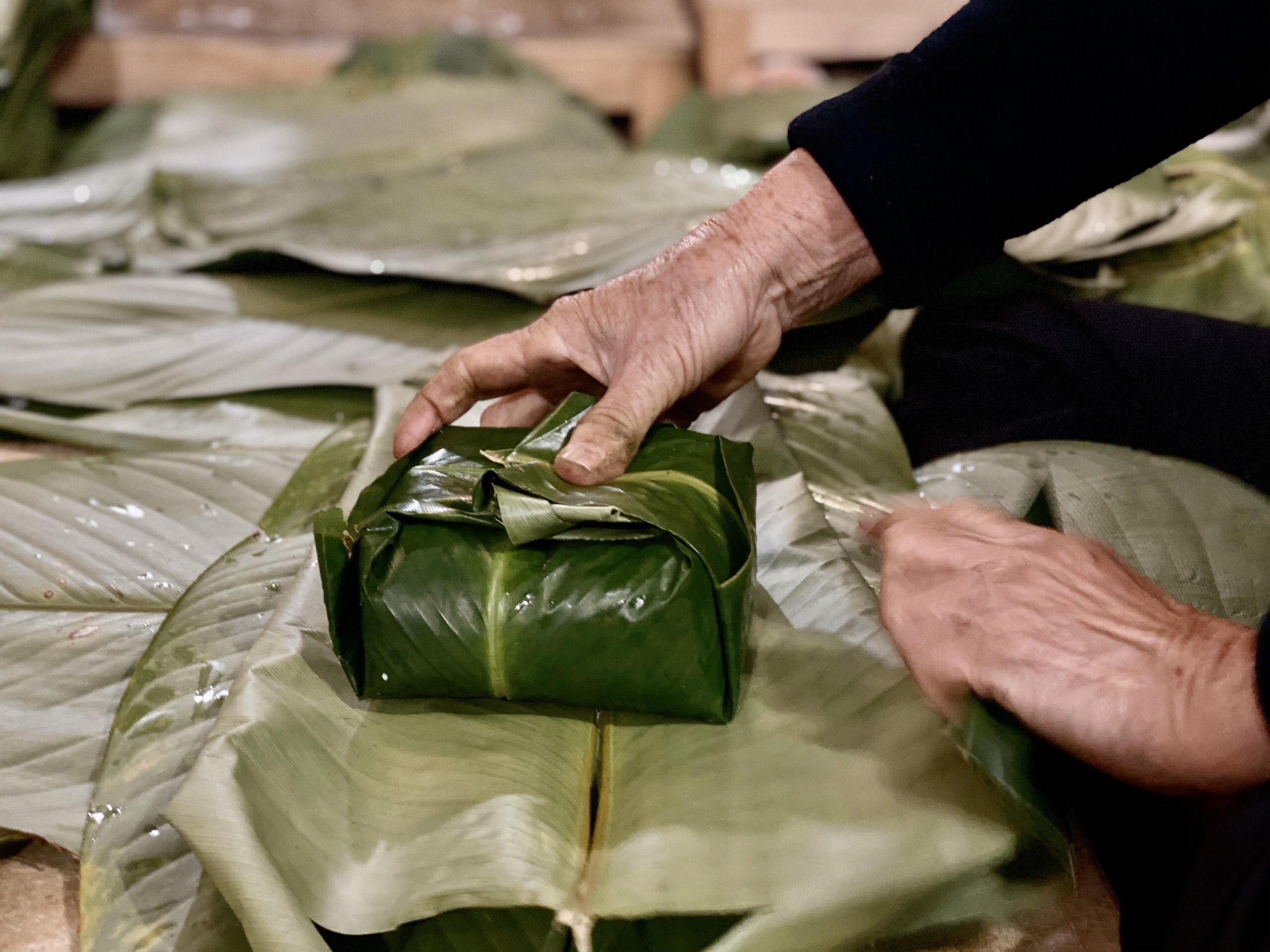 Bánh chưng Diệm Xuân hoàn toàn được gói bằng tay mà không hề sử dụng khuôn. |