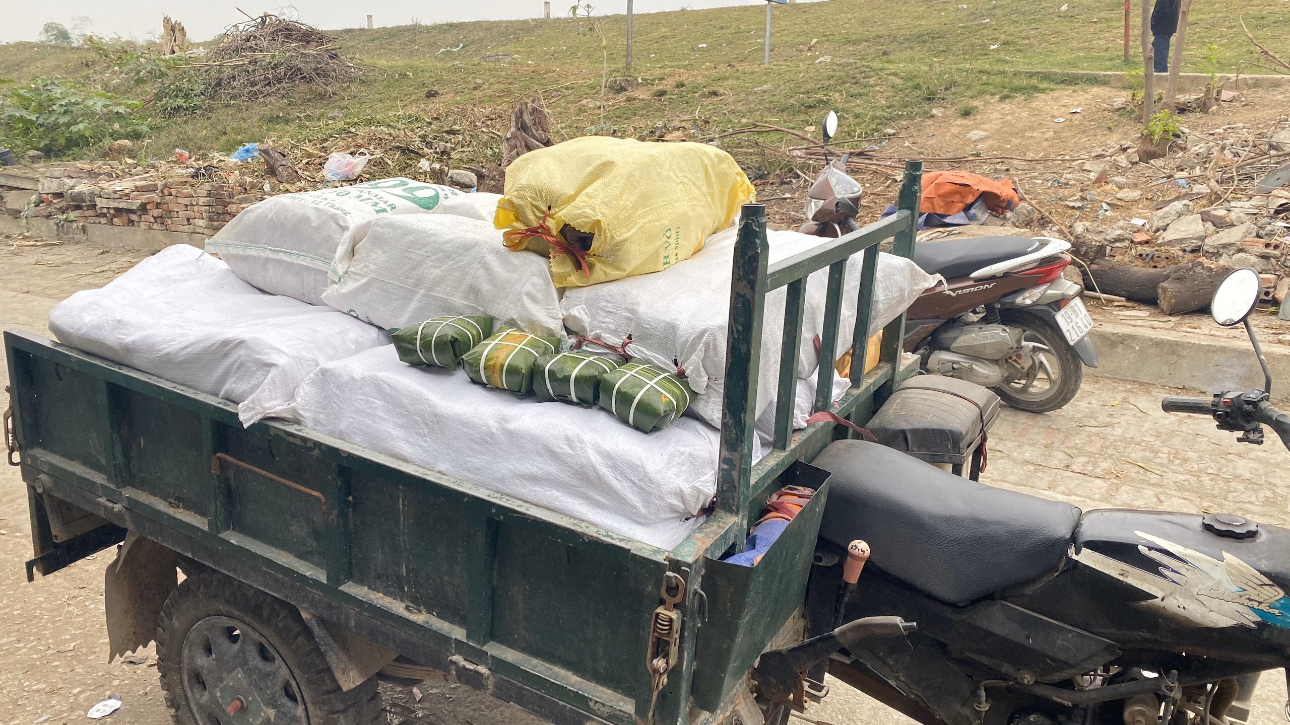 Những chiếc bánh chưng được xếp lên xe, để gia đình ông Phan Bá Miền đem đi giao cho khách hàng. |