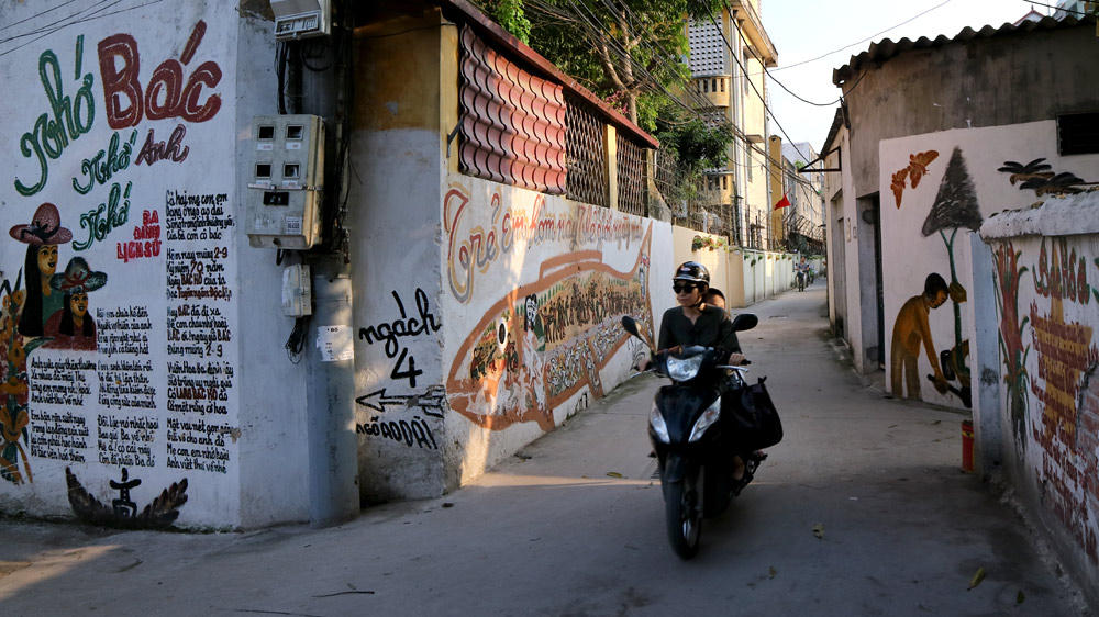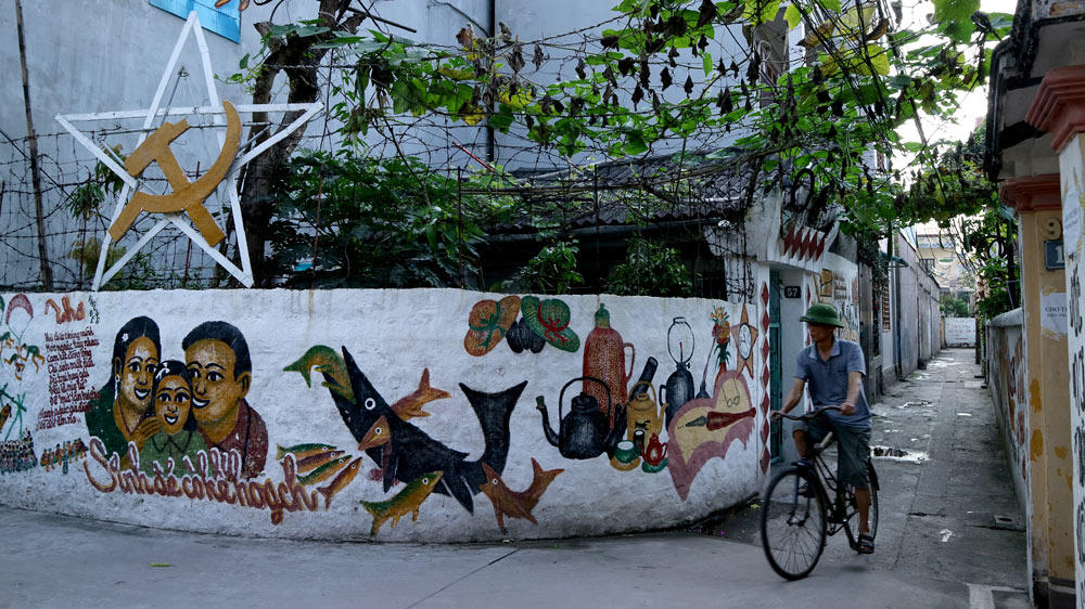 | Một bức bích họa được vẽ theo phong cách tranh cổ động kêu gọi khuyến khích trồng cây xanh đầu một ngách thuộc ngõ Ao Dài.