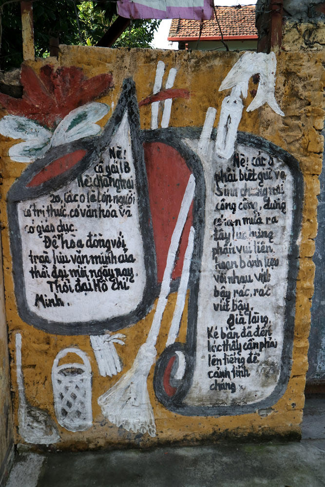 Những bức họa lớn được vẽ dọc các bờ tường trình bày theo kiểu báo tường (bích báo) với mỗi đoạn truyền tải nội dung tuyên truyền, răn dạy về đạo đức, ý thức bảo vệ môi trường, tình yêu quê hương, Tổ Quốc...