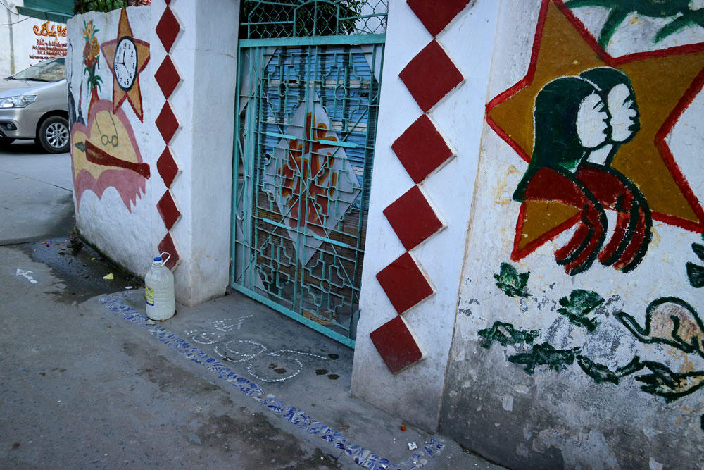 | Cổng nhà cụ Cao Chí Thịnh cũng được trang trí bằng những bức họa đầy màu sắc tươi vui. |
