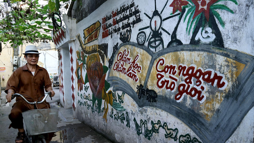 Ông Hưng, tổ trưởng tổ dân phố số 2, phường Đức Thắng cho biết, toàn bộ các bức bích báo, bích họa sống động, đẹp tuyệt này đều do một tay cụ Cao Chí Thịnh vẽ nên từ gần 20 năm nay.