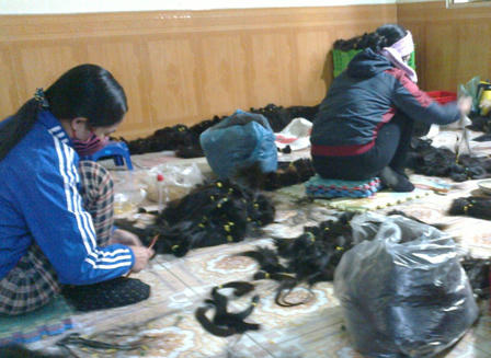 Sau khi thu mua về, tóc sẽ được sơ chế, chăm sóc, phân loại tại các xưởng gia công. Từng lọn tóc được người thợ dùng lược chải gỡ rối, sau đó dùng dầu gội lại (có khi còn nhuộm lại màu đen). Thông thường, mỗi xưởng gia công tóc đều do một hộ gia đình quản lý.
