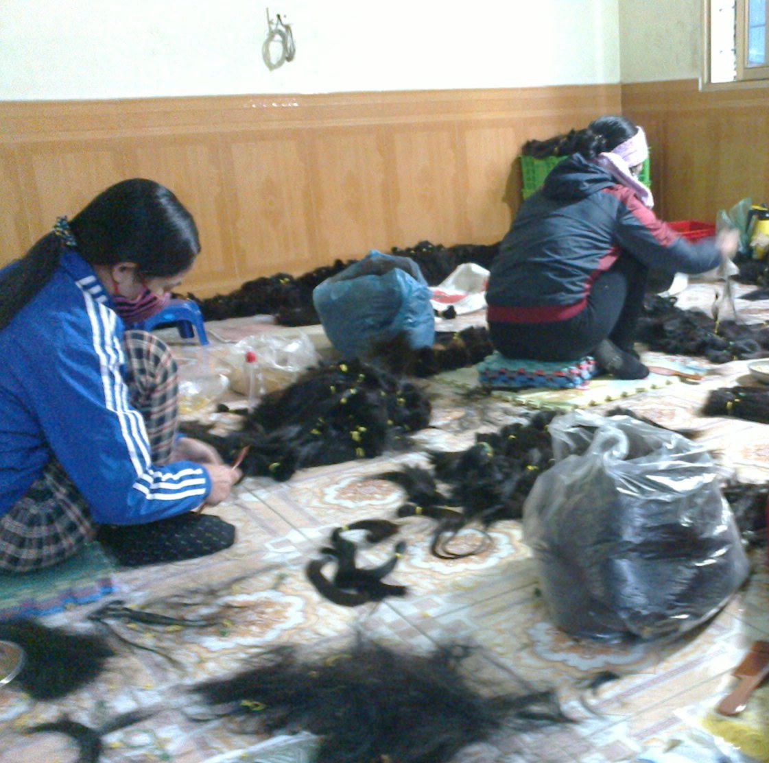 Sau khi thu mua về, tóc sẽ được sơ chế, chăm sóc, phân loại tại các xưởng gia công. Từng lọn tóc được người thợ dùng lược chải gỡ rối, sau đó dùng dầu gội lại (có khi còn nhuộm lại màu đen). Thông thường, mỗi xưởng gia công tóc đều do một hộ gia đình quản lý. Có những hộ gia đình tất cả thành viên đều tham gia vào các công đoạn làm tóc. Phụ nữ ở nhà làm công việc “chăm sóc”, đàn ông lên đường đi kiếm “hàng”. Có những hộ truyền nghề này từ đời này sang đời khác, quanh năm tất bật với “tóc là tóc”.