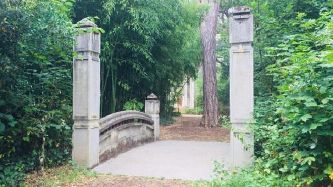 Từ lối chính, rẽ sang phải là một lối mòn ẩn dưới những tán cây dẫn đến một cây cầu cong cong đậm chất Bắc Kỳ, có hai trụ đầu cầu, được xây bằng xi-măng năm 1907, bắc qua con lạch nhỏ róc rách ngay sát lũy tre xào xạc đặc trưng của đồng bằng Bắc Bộ. Từ đây mở ra cả một không gian lớn với những công trình kiến trúc đặc trưng của ba miền Việt Nam.