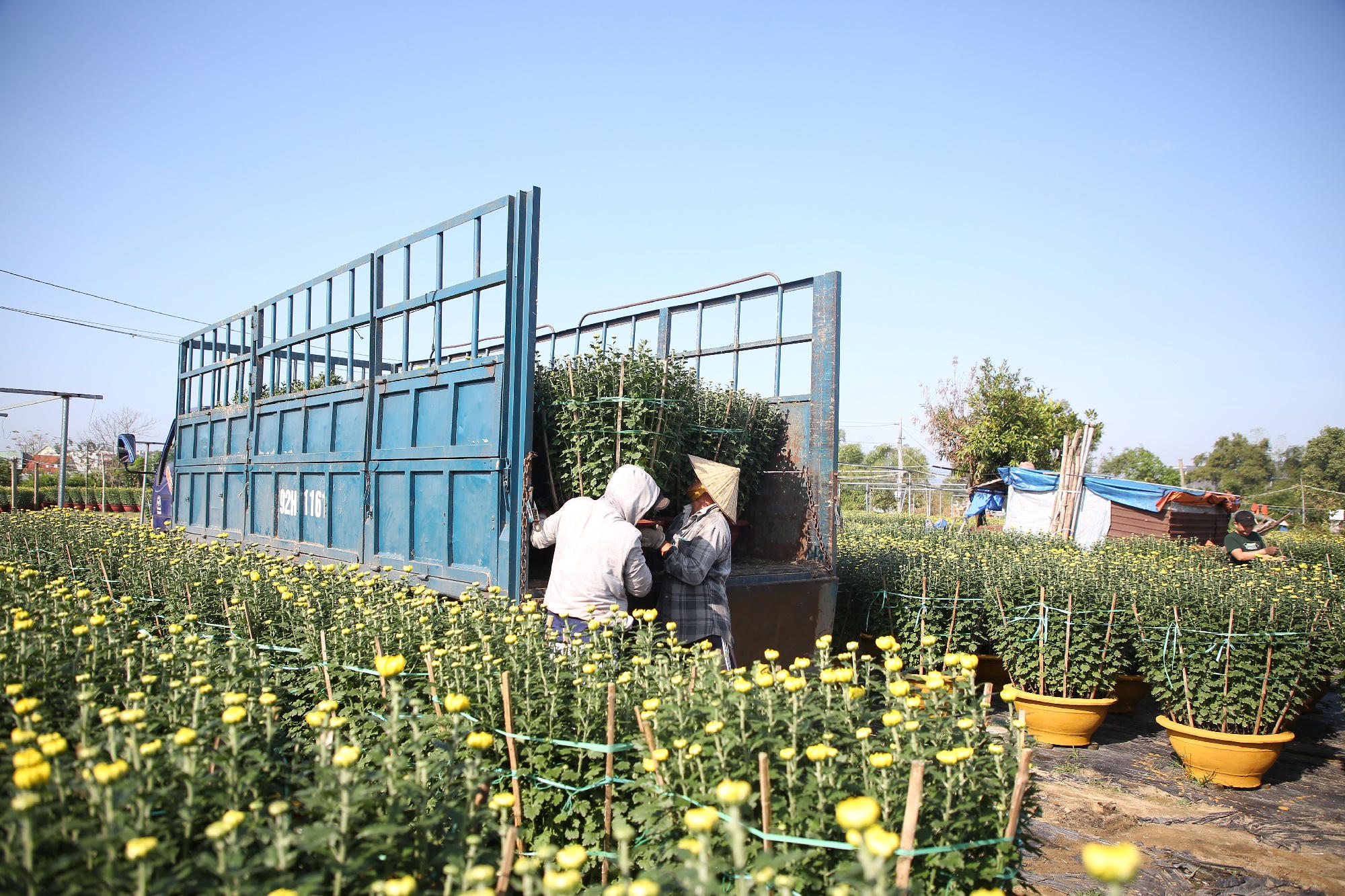 Thời tiết Đà Nẵng những ngày cuối năm nắng đẹp, các chủ vườn hoa thuê nhân công đưa hoa đến điểm tập kết để chờ xe tải đến chở đi giao hoa cho các "đầu mối" đã đặt mua trước đó.