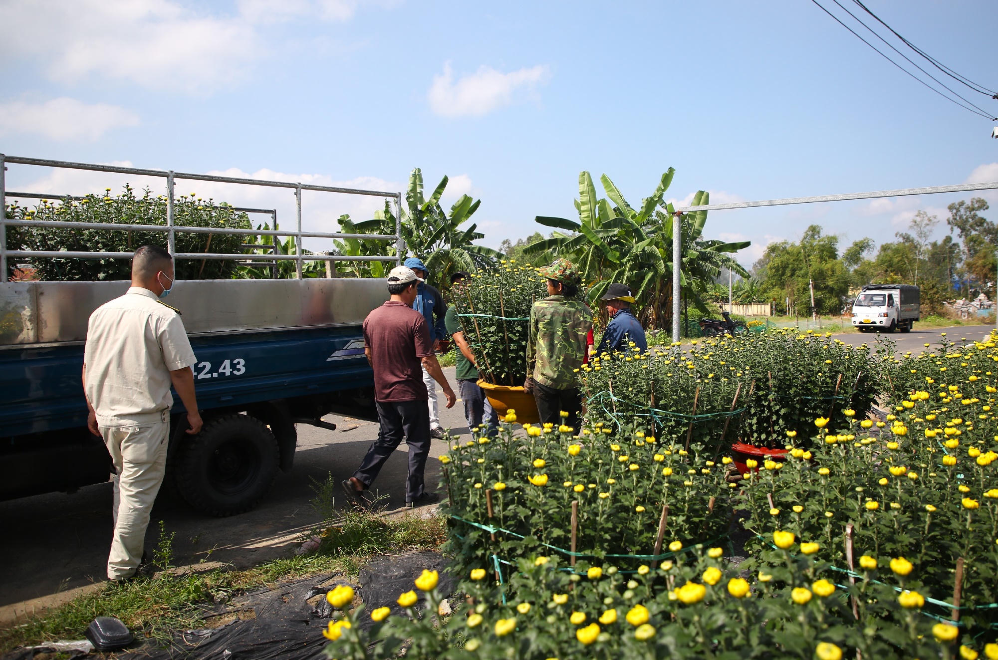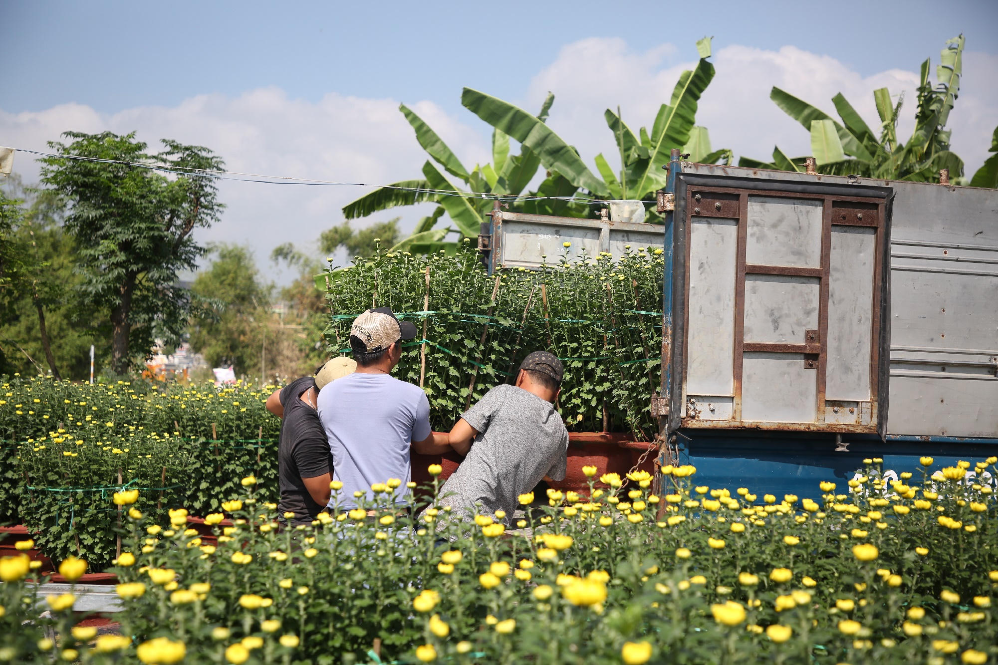 Thương lái đến thu mua hoa tại vườn của người dân.