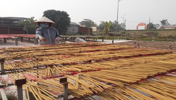 Trên khắp các đường làng, ngõ, xóm, hương được rải đều tăm tắp trên các giá phơi, không khí lao động sản xuất tại các cơ sở làm hương diễn ra nhộn nhịp. Người trộn bột, người xe hương, người phơi, người đóng gói, ai nấy đều cố gắng nhanh tay để hoàn thành những đơn hàng phục vụ thị trường dịp Tết Nguyên đán.