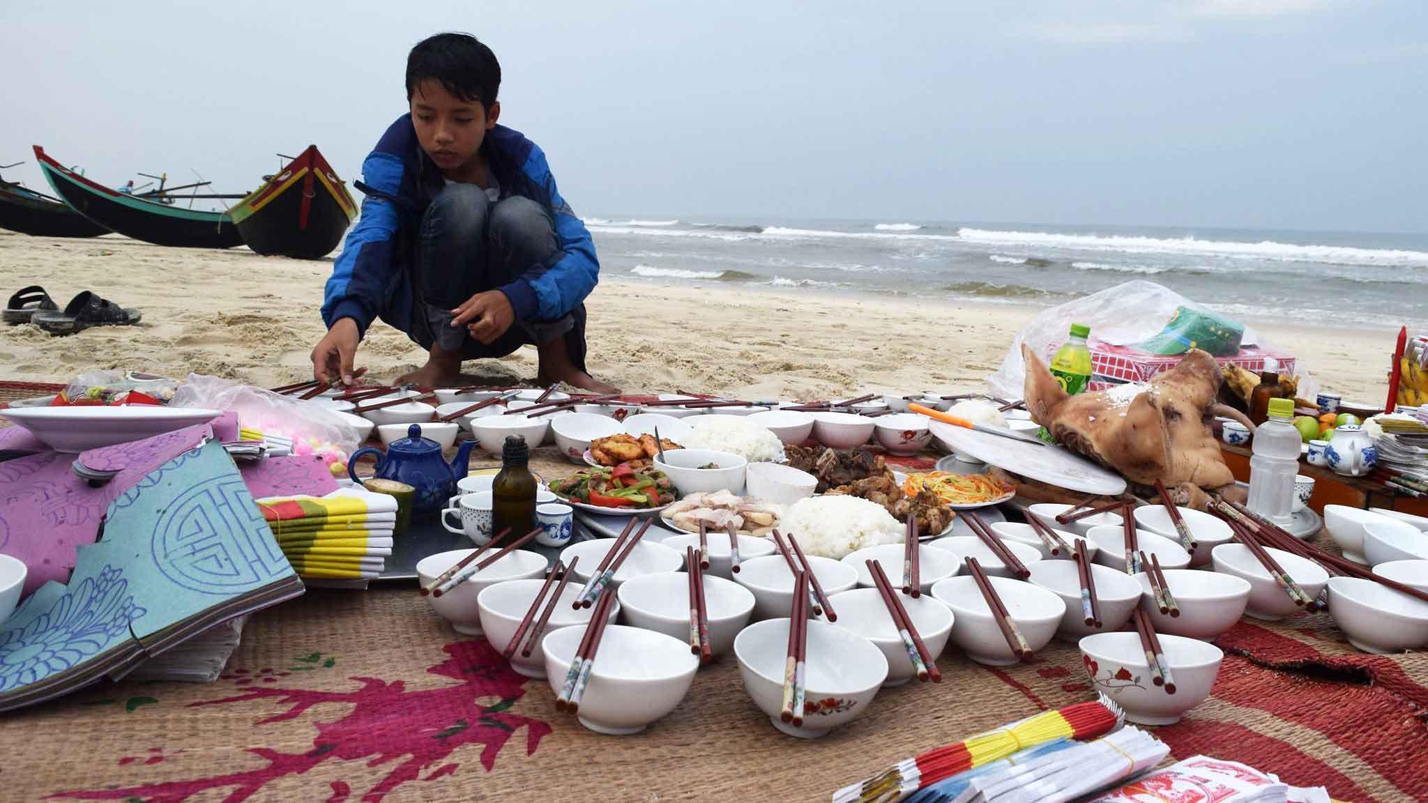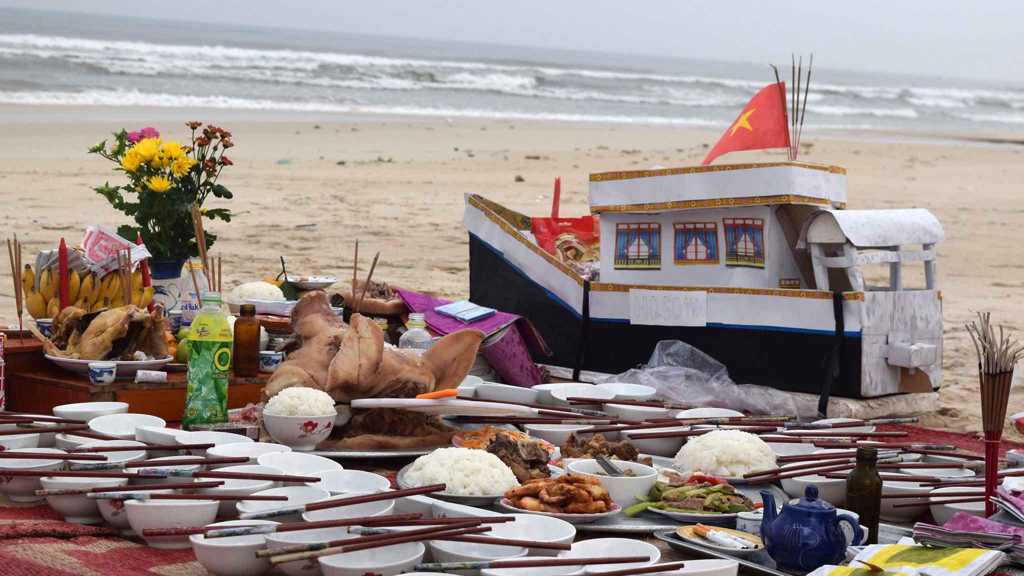 Mâm cúng được đặt trên cát, hướng thẳng ra biển. Ngoài 64 cái bát, 64 đôi đũa, anh Hoành còn chuẩn bị con tàu Hải quân bằng giấy mang số hiệu HQ 604 để thả xuống biển cho anh trai và đồng đội.