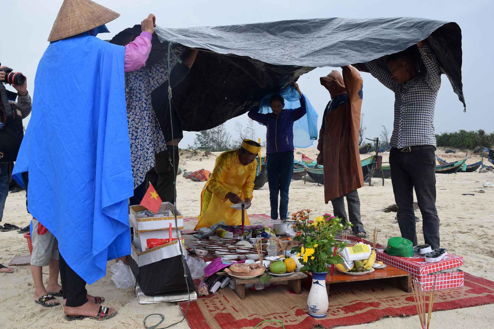 Đang cúng, trời lại đổ mưa nặng hạt, người nhà anh Hoành phải căng bạt, đứng các góc giữ để ông Thuận thực hiện lễ cúng.