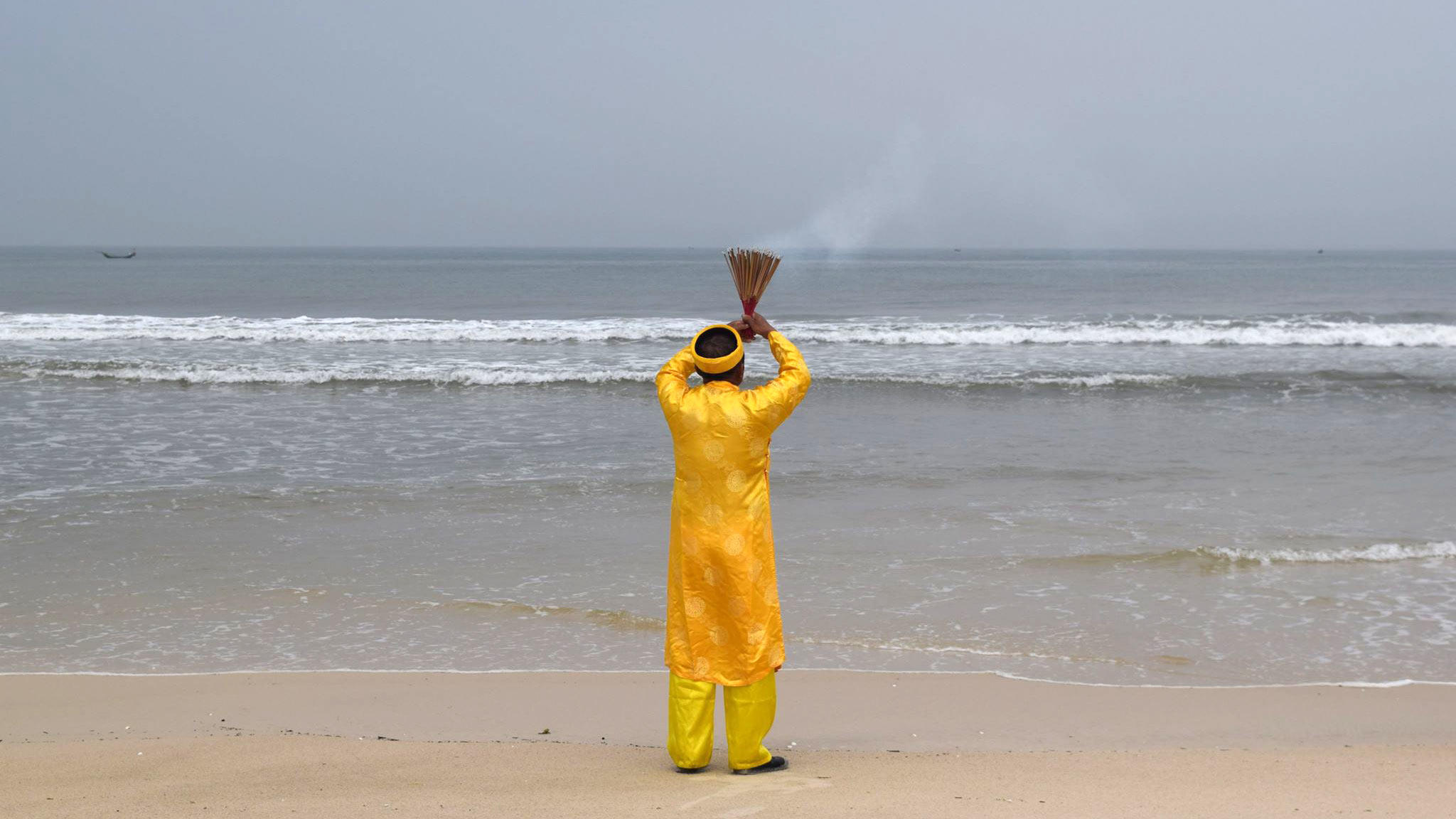 Nhìn về phía biển ông Thuận đọc lời khấn: “Hôm nay là ngày 27 tháng Giêng năm Mậu Tuất, ngày mất của anh Trương Văn Hướng cùng 63 đồng đội. Các anh đã hi sinh vì bảo vệ từng tấc đất của quê hương. Gia đình không có gì hơn, chỉ có mâm cơm, chén rượu lạt và nén hương thơm thắp lên đây mời các anh cùng về dự...”.