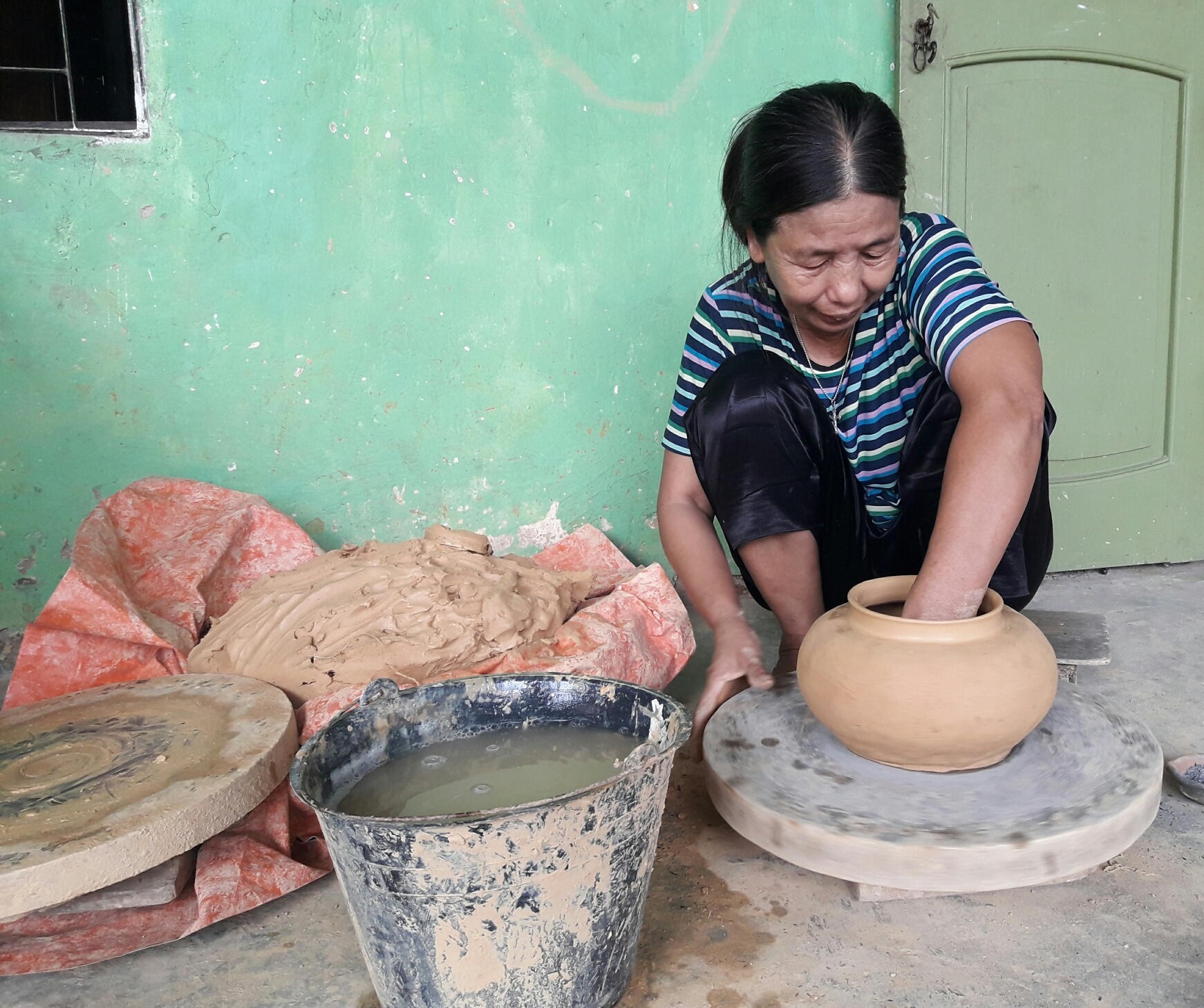 Những khối đất được ủ thành đống, che chắn tránh nắng, mưa cẩn thận. Khi làm gốm, người thợ dùng liềm cắt đất ra từng lát mỏng, sau đó đặt lên phiến đá có mặt hơi lõm, dùng chầy giã, mục đích làm cho đất nhuyễn, có độ dẻo.