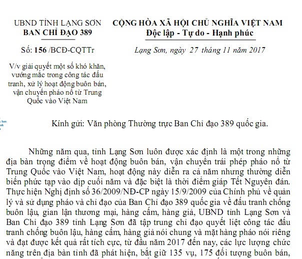 Theo đó, ngày 27/11 vừa qua, ông Nguyễn Công Trưởng, Phó Chủ tịch UBND tỉnh Lạng Sơn, Trưởng Ban chỉ đạo 389 tỉnh Lạng Sơn đã ký Công văn số 156/BCĐ-CQTTr gửi Văn phòng thường trực Ban chỉ đạo 389 Quốc gia về việc giải quyết một số khó khăn, vướng mắc trong công tác đấu tranh, xử lý hoạt động buôn bán, vận chuyển pháo từ Trung Quốc vào Việt Nam.