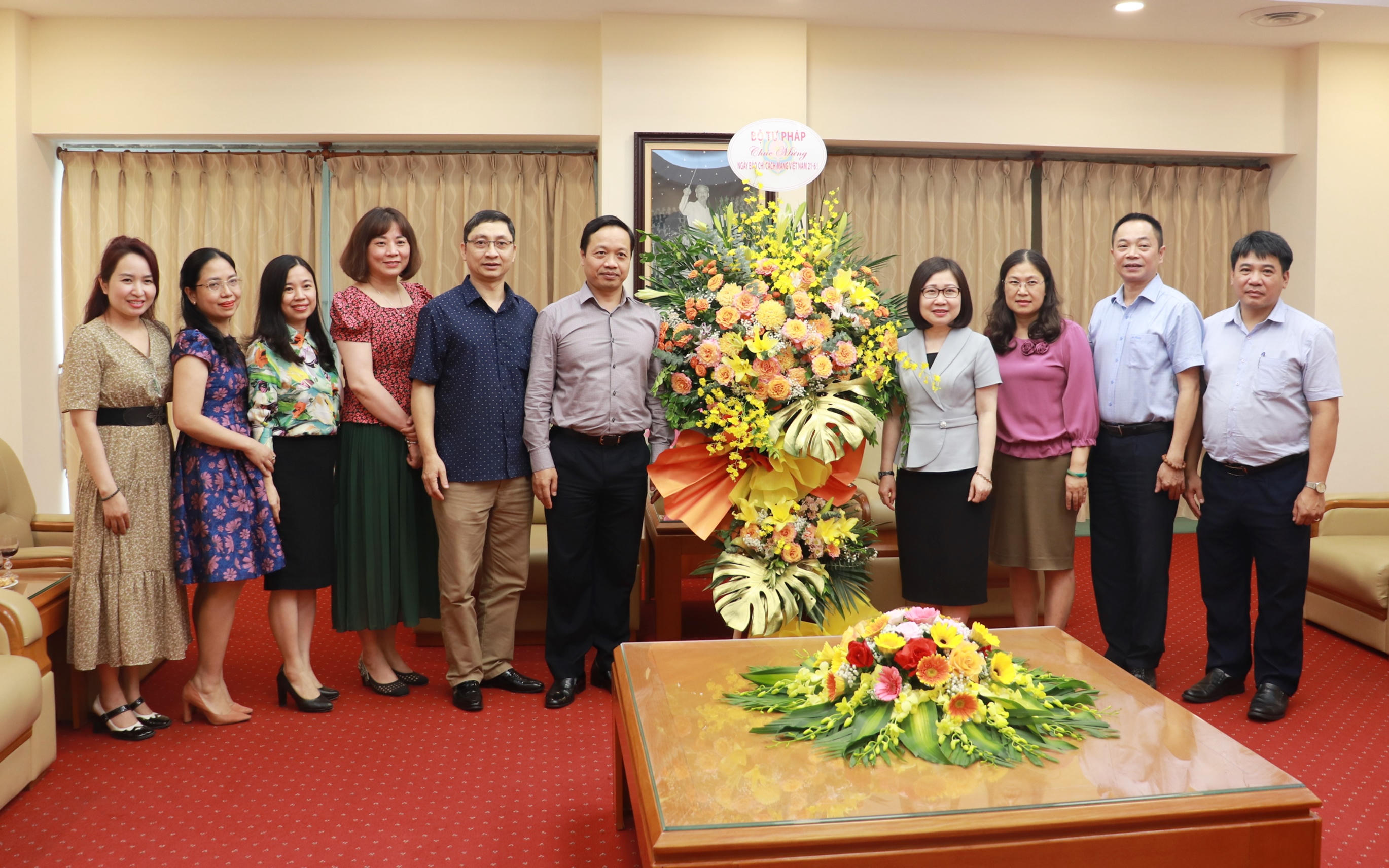 (PLVN) - Nhân kỷ niệm 98 năm Ngày Báo chí cách mạng Việt Nam, Đoàn cán bộ Bộ Tư pháp do các Thứ trưởng Nguyễn Khánh Ngọc, Đặng Hoàng Oanh, Nguyễn Thanh Tịnh, Mai Lương Khôi, Trần Tiến Dũng dẫn đầu đã đến tặng hoa chúc mừng một số cơ quan thông tấn, báo chí.