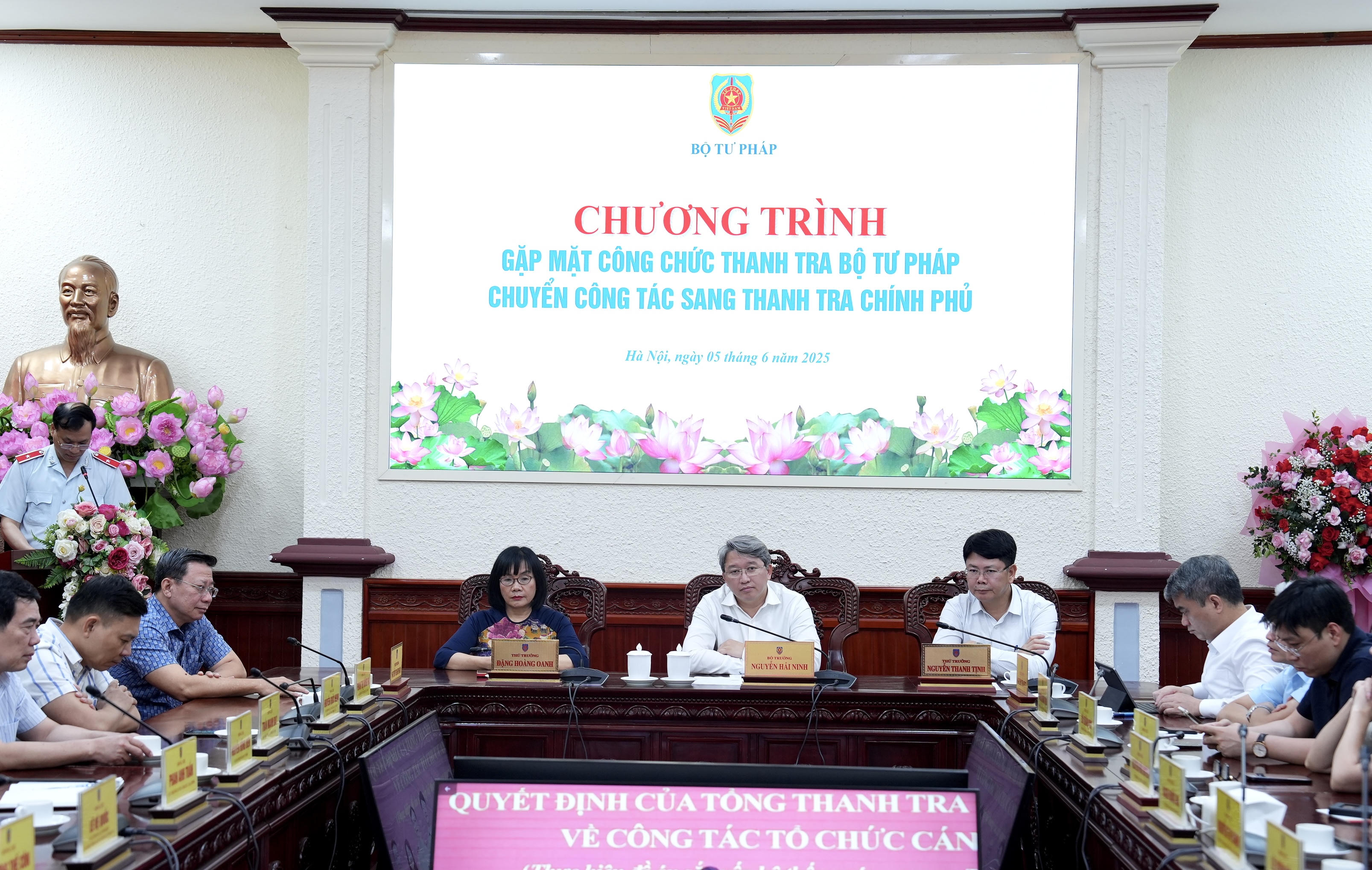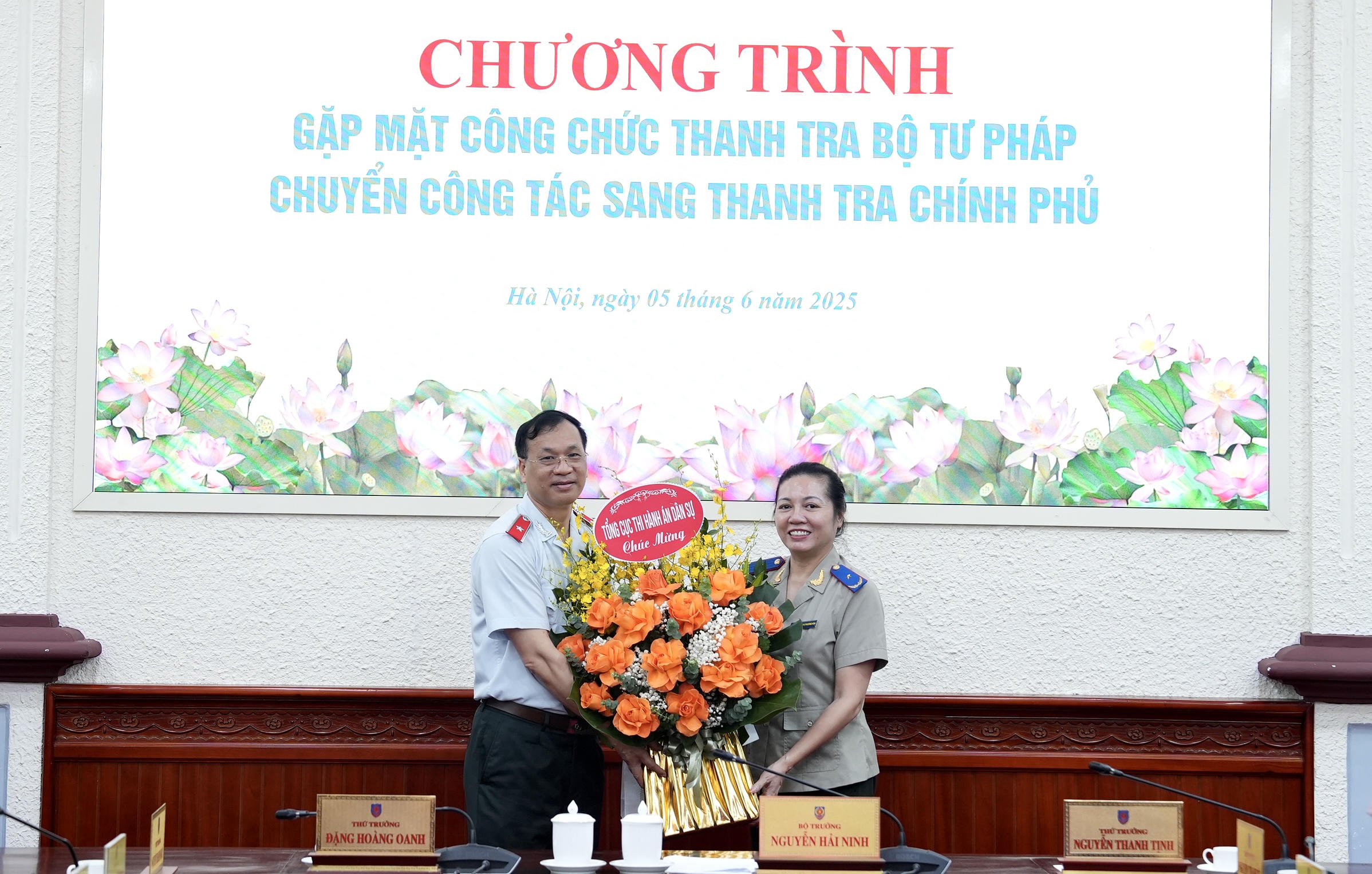 Cùng dự có các Thứ trưởng: Đặng Hoàng Oanh, Nguyễn Thanh Tịnh, Nguyễn Thanh Tú, Nguyễn Thanh Ngọc; lãnh đạo các đơn vị liên quan và toàn thể công chức của Thanh tra Bộ chuyển công tác sang Thanh tra Chính phủ cũng như các công chức của Thanh tra Bộ sẽ nghỉ hưu và điều động về các đơn vị thuộc Bộ.