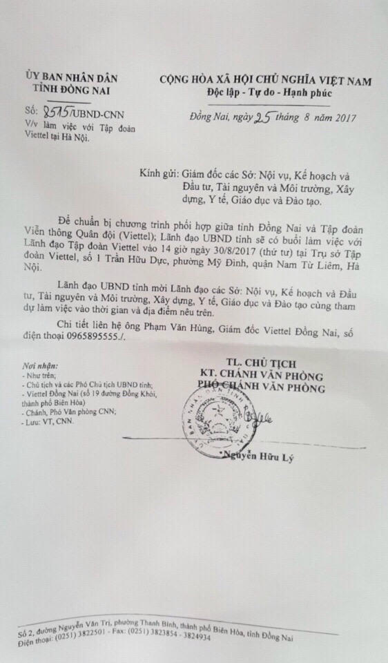Để chuẩn bị chương trình phối hợp giữa tỉnh Đồng Nai và Tập đoàn Viễn Thông Quân đội (Viettel), ngày 30/8, lãnh đạo UBND tỉnh Đồng Nai đã có buổi làm việc với Tập đoàn Viettel tại Hà Nội (trụ sở của Viettel, số 1, Trần Hữu Dực, phường Mỹ Đình, quận Nam Từ Liêm, Hà Nội)