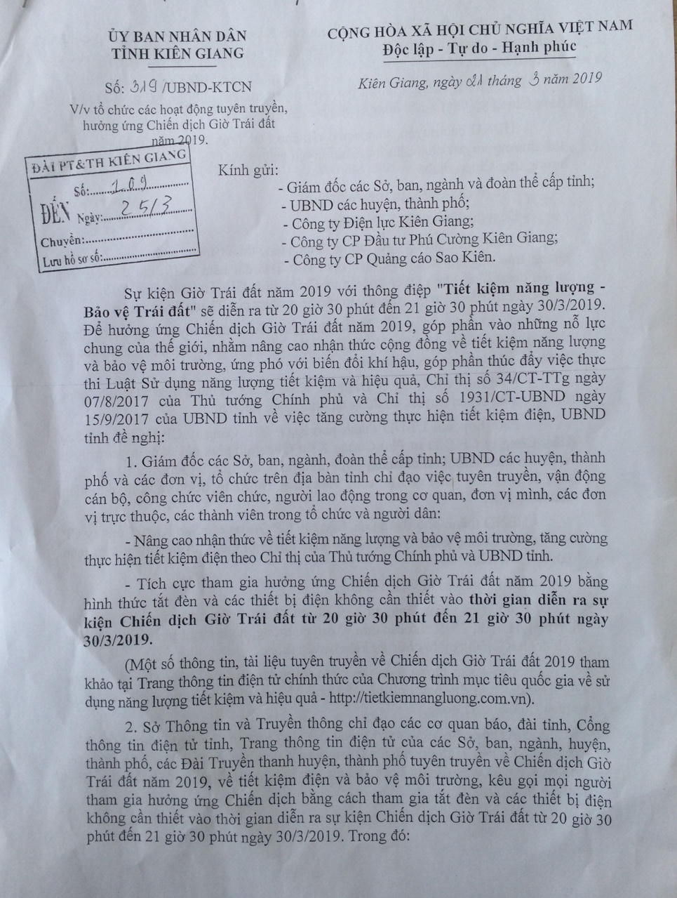 Chiến dịch “Giờ Trái đất” năm 2019 do Bộ Công Thương phát động sẽ chính thức diễn ra trên toàn quốc bắt đầu từ 20h30 đến 21h30 ngày 30/3 tới. Hưởng ứng sự kiện này, UBND Tỉnh Kiên Giang đã ban hành công văn số 319 ngày 21/03/2019 về việc chỉ đạo các phòng ban, đơn vị liên quan trên địa bàn tổ chức các hoạt động tuyên truyền hưởng ứng Chiến dịch Giờ Trái đất năm 2019, nhằm góp phần nâng cao ý thức tiết kiệm điện và bảo vệ môi trường.