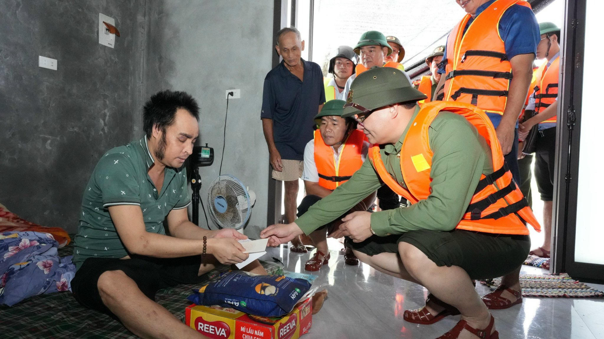 Đại tá Nguyễn Thanh Tuấn - Giám đốc Công an tỉnh Thừa Thiên Huế thăm hỏi, tặng quà gia đình bị ngập lụt. |