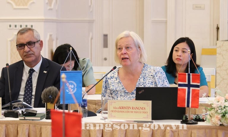 Bà Kristin Rangnes, chuyên gia mạng lưới Công viên địa chất toàn cầu UNESCO phát biểu. (Ảnh: langson.gov.vn). |