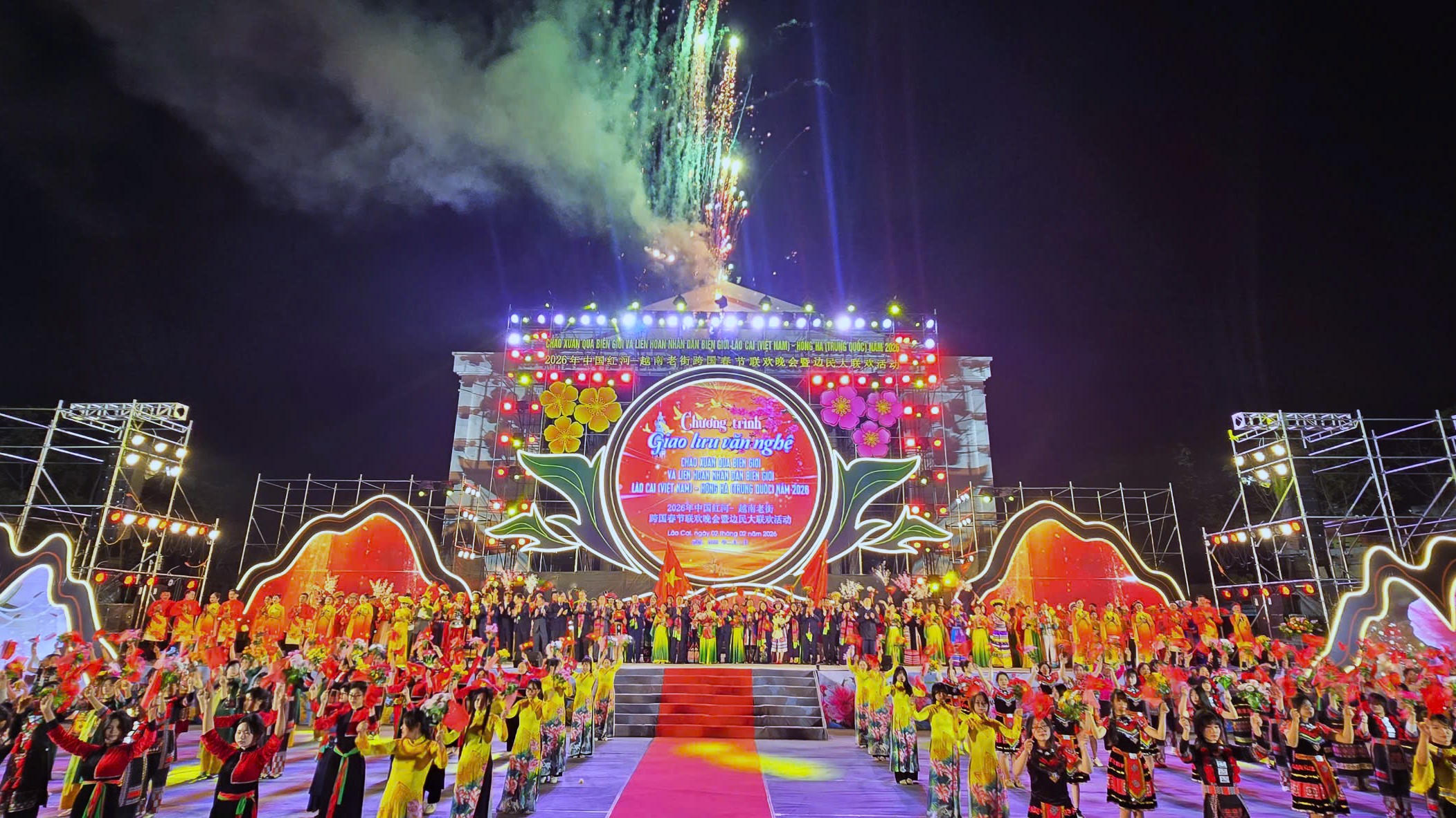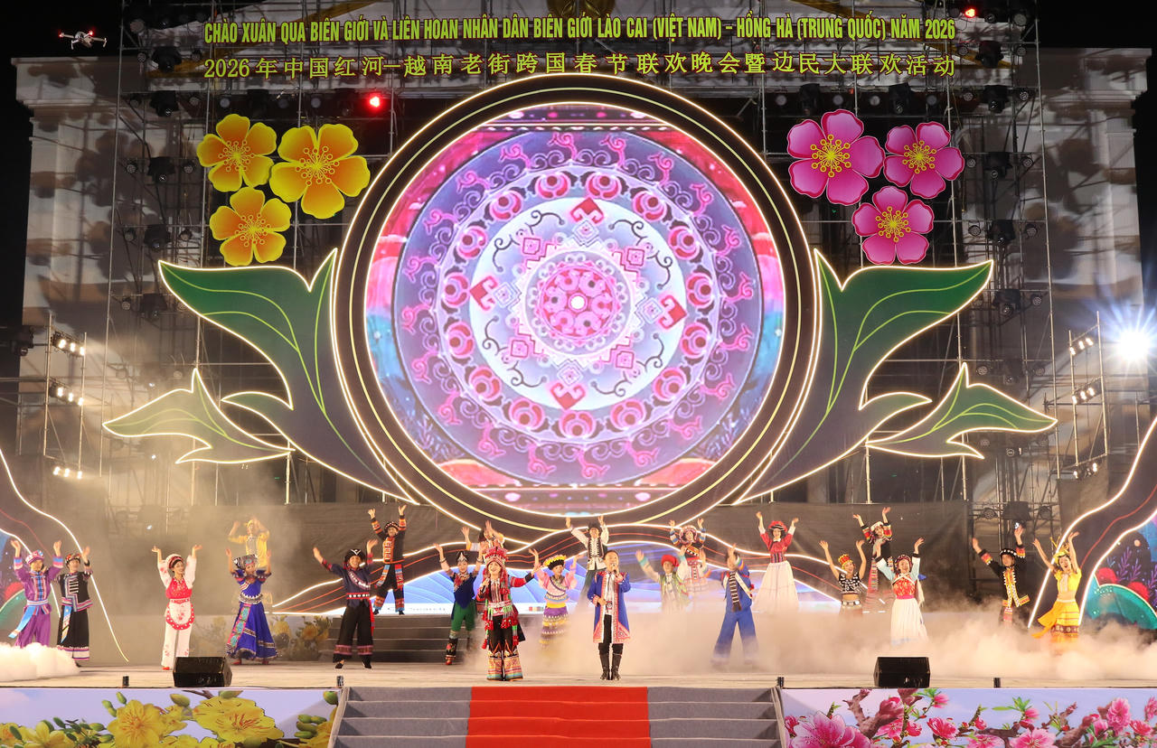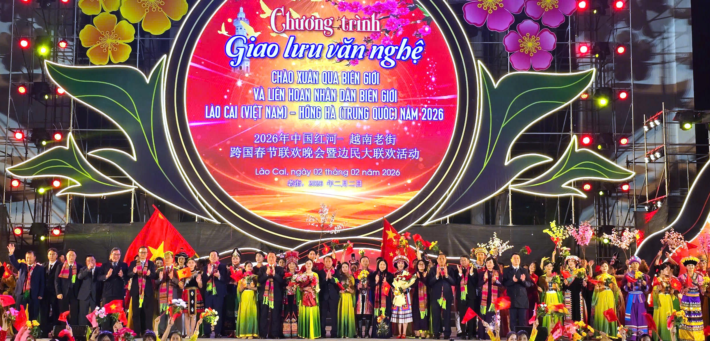 (PLVN) - Tối 2/2, tại Quảng trường Kim Tân (phường Lào Cai, tỉnh Lào Cai), Chương trình Giao lưu văn nghệ “Chào Xuân qua biên giới” và Liên hoan nhân dân biên giới Lào Cai (Việt Nam) - Hồng Hà (Trung Quốc) năm 2026 đã diễn ra trong không khí trang trọng, ấm áp, mở đầu cho Năm giao lưu nhân văn Việt Nam - Trung Quốc và chào mừng kỷ niệm 76 năm thiết lập quan hệ ngoại giao giữa hai nước.