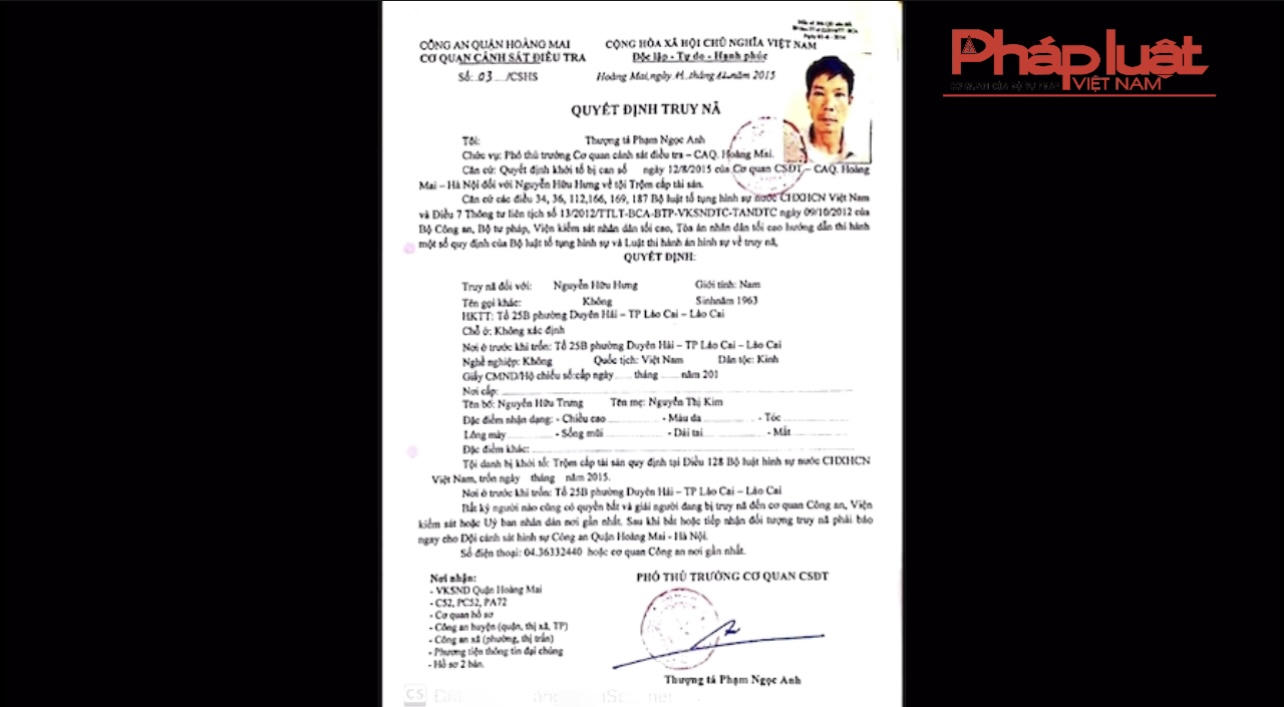 Hưng là đối tượng bị truy nã theo quyết định số 03/CSHS ngày 11/12/2015 của Cơ quan Cảnh sát điều tra, Công an quận Hoàng Mai, thành phố Hà Nội về hành vi “trộm cắp tài sản”. Được biết Hưng là đối tượng đã có nhiều tiền án về tội trộm cắp tài sản.
