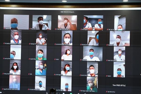 Buổi gặp mặt trực tuyến thể hiện sự quan tâm của lãnh đạo tỉnh đối với các cán bộ y tế làm nhiệm vụ ở tuyến đầu chống dịch. ảnh: Báo Lào Cai. |