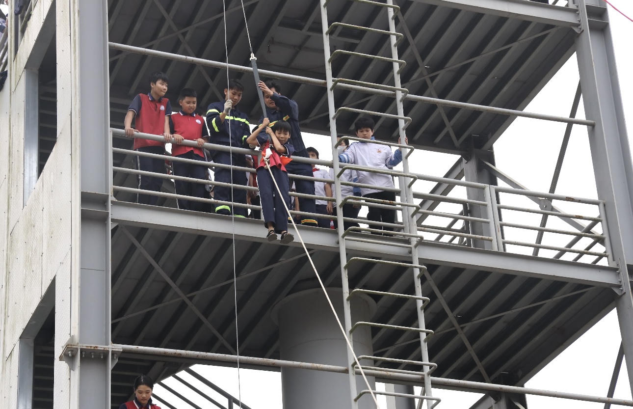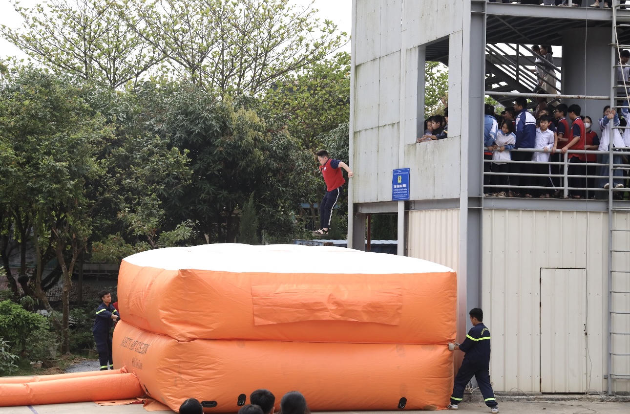 Các cán bộ chiến sỹ hướng dẫn kỹ thuật cứu người bị nạn trên cao bằng phương pháp nhảy đệm hơi