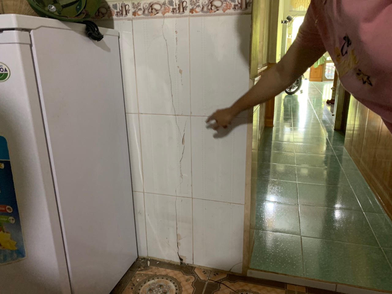 Các hộ dân gần đó như ngôi nhà gia đình chị Đinh Thị Liên cũng cùng chung cảnh ngộ, các vết nứt có chiều rộng từ 2 đến 5 cm ngoằn ngèo ngang sân, nhà chính, nhà bếp, nhà vệ sinh, thậm chí kéo giằng lên cả tầng 2 rất nguy hiểm.