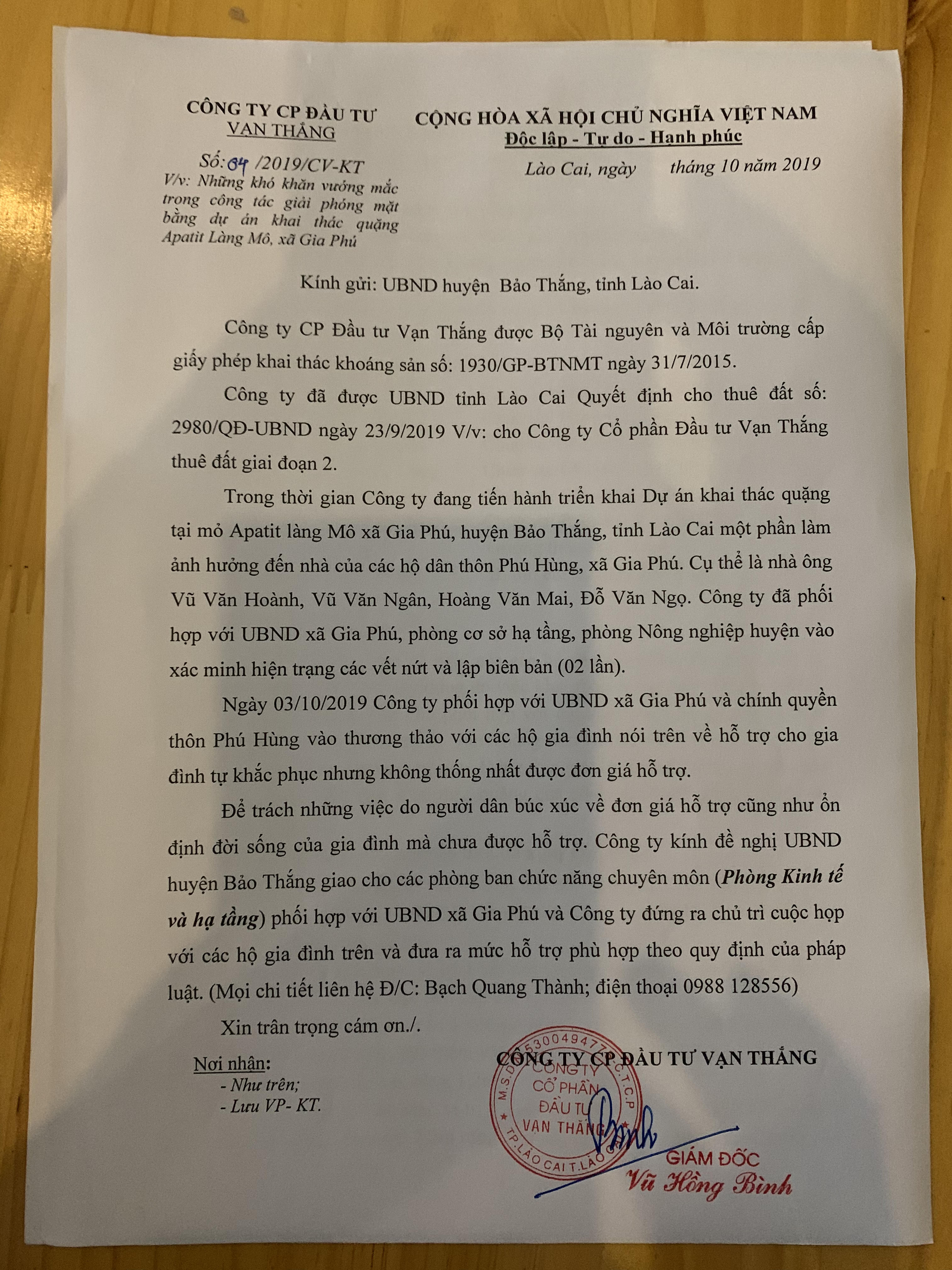 Đơn thư sau đó tiếp tục được gửi lên UBND xã Gia Phú, 5 ngày sau Ban đại diện xã Gia Phú có đến xem xét rồi hẹn 01 tháng sau quay trở lại nhưng đến hiện nay đã quá hạn rất lâu vẫn chưa thấy động tĩnh gì. Các hộ dân mong được đền bù sửa chữa công trình lún, nứt và yêu cầu Cty Vạn Thắng dừng việc nổ mìn khai thác quặng sát khu dân cư để người dân được an tâm, ổn định cuộc sống.