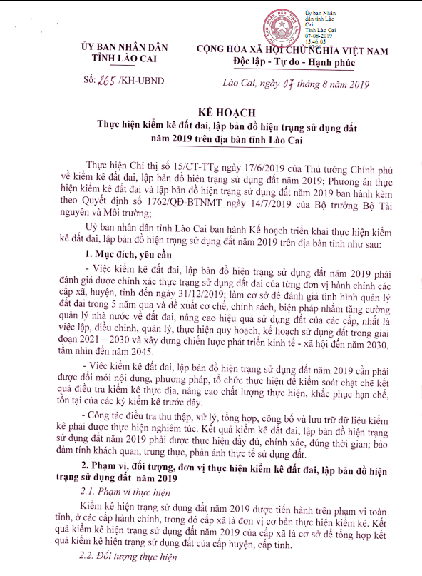 Theo đó, thực hiện chỉ thị số 15/CT-TTg ngày 17/06/2019 của Thủ tướng Chính phủ về kiểm kê đất đai, lập bản đồ hiện trạng sử dụng đất năm 2019; phương án thực hiện kiểm kê đất đai và lập bản đồ hiện trạng sử dụng đất năm 2019 ban hành kèm theo quyết định số 1762/QĐ-BTNMT ngày 14/07/2019 của Bộ trưởng Bộ Tài nguyên và Môi trường. UBND tỉnh Lào Cai đã ban hành kế hoạch triển khai thực hiện kiểm kê đất đai, lập bản đồ hiện trạng sử dụng đất năm 2019 trên địa bàn tỉnh.