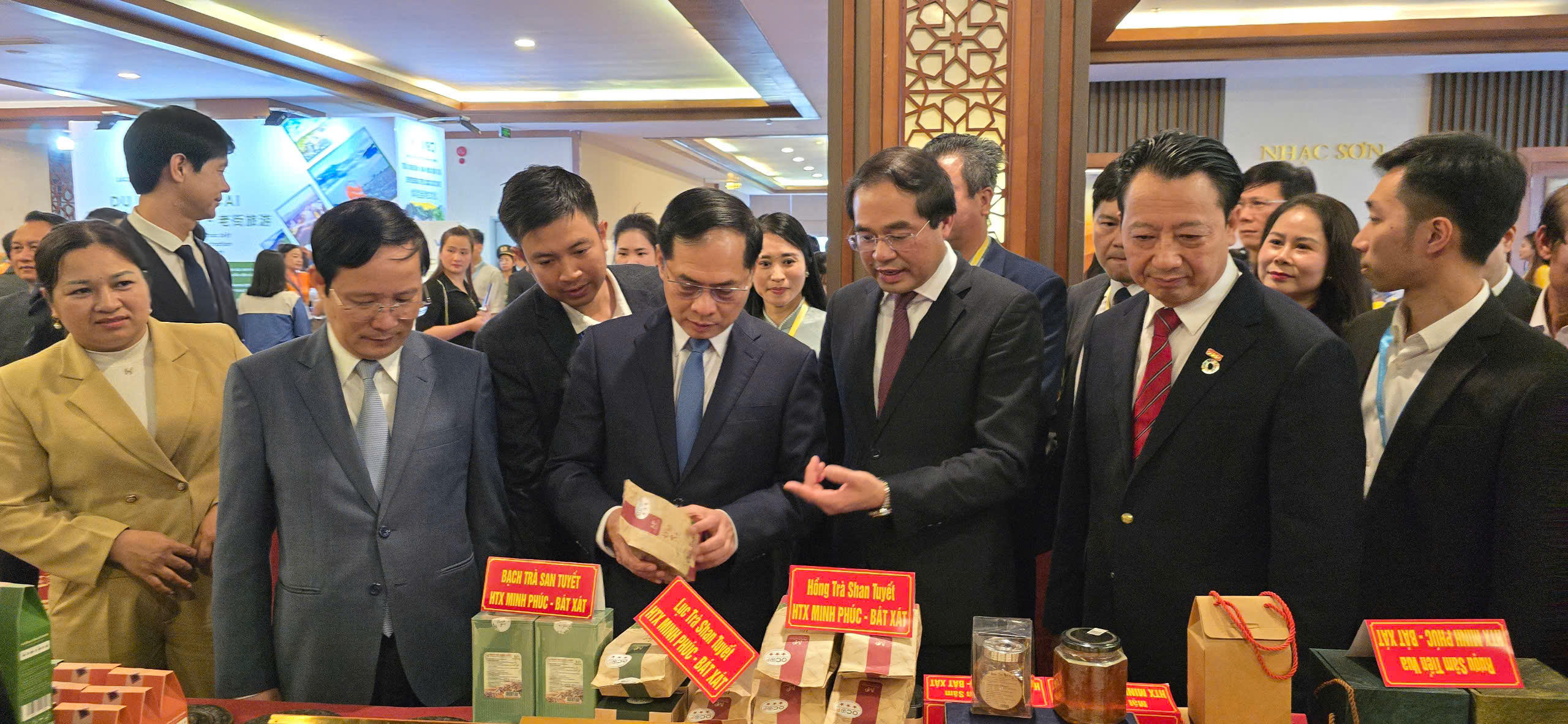 Phó Thủ tướng Chính phủ, Bộ trưởng Bộ Ngoại giao Bùi Thanh Sơn cùng các đại biểu tham quan không gian trưng bày các sản phẩm của tỉnh Lào Cai. |