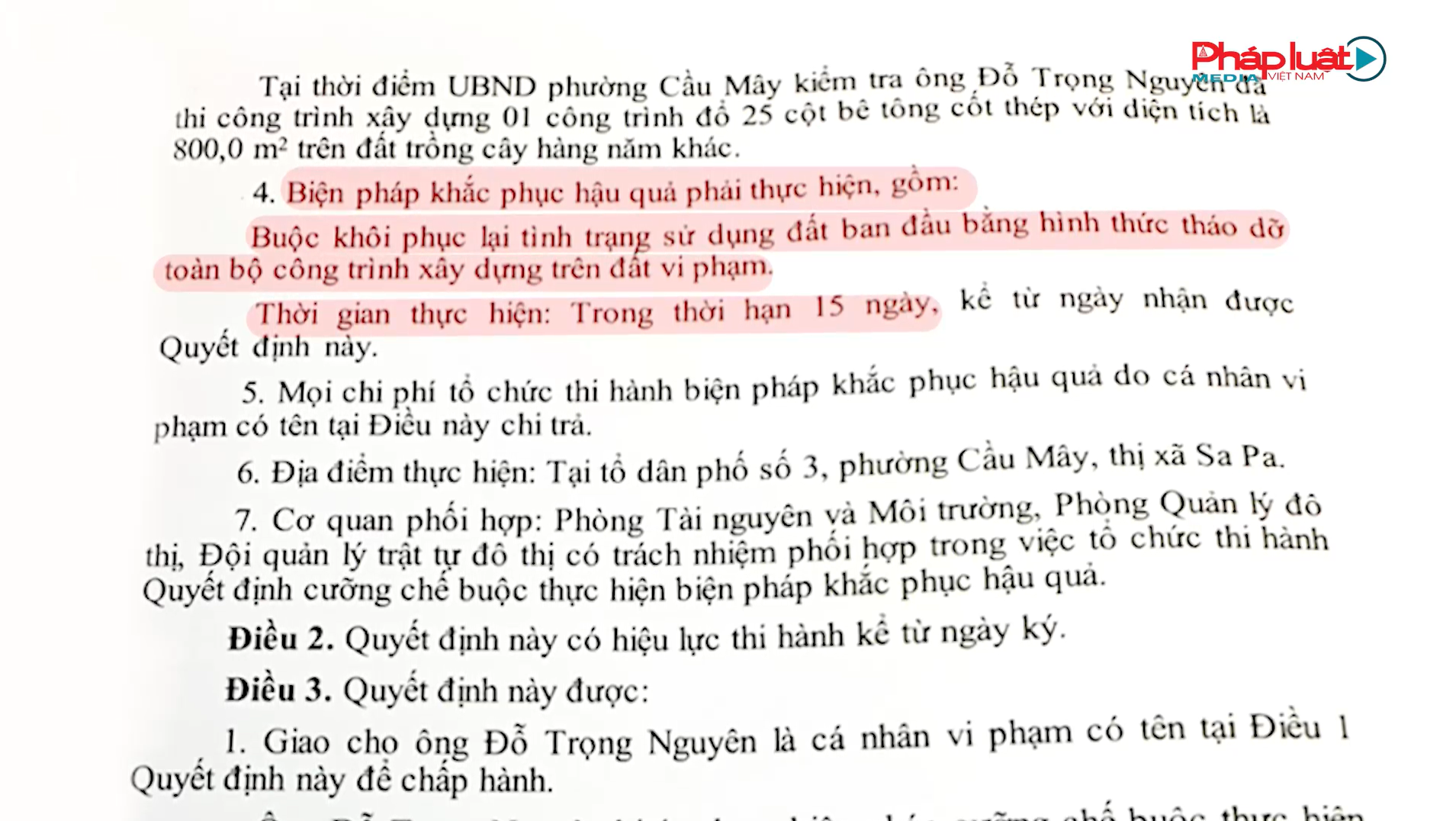 Lãnh đạo UBND thị xã Sa Pa giao Chủ tịch UBND phường Cầu Mây phối hợp với Phòng Tài nguyên và Môi trường, Phòng quản lý đô thị, Đội trật tự đô thị tổ chức thi hành quyết định cưỡng chế buộc thực hiện khắc phục hậu quả; chủ trì tổ chức thực hiện, tổ chức cưỡng chế trong thời hạn 30 ngày kể từ ngày ông Đỗ Trọng Nguyên nhận được quyết định này. Tuy nhiên, cho đến thời điểm hiện tại thì cá nhân ông Đỗ Trọng Nguyên và phía UBND phường Cầu Mây đều chưa thực hiện theo quyết định này.