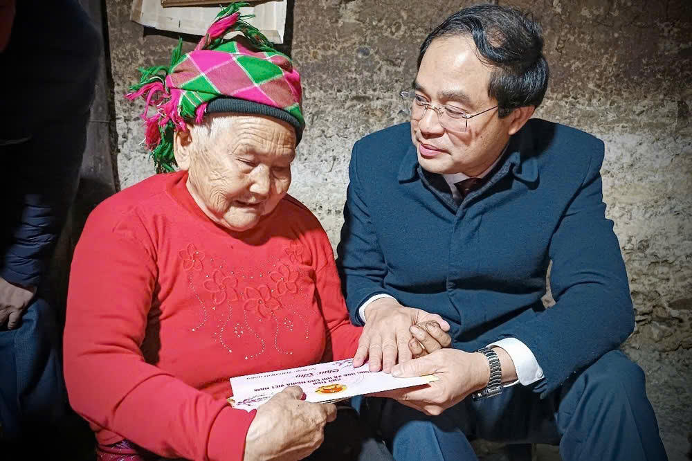 Bí thư Tỉnh ủy, Chủ tịch UBND tỉnh Lào Cai Trịnh Xuân Trường trao quà của Chủ tịch nước cho bà Lý A Say, sinh năm 1925, người tròn 100 tuổi, cư trú tại thôn Phù Lao Chải, xã A Mú Sung. |