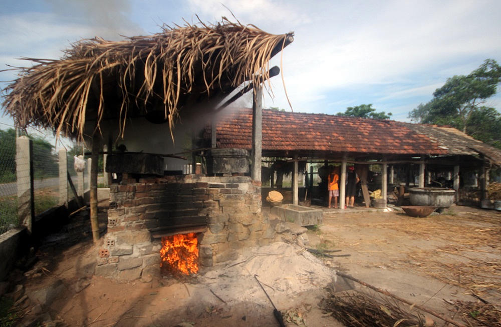 Trong làn khói bốc lên, không gian dậy mùi thơm nức, ngọt ngào. Năm cái chảo nấu đường bằng gang nằm thẳng tắp trên bệ lò. Ít bữa trước đó, vài tháng tắt lửa chờ đến Xuân, thành chảo trở màu đen xỉn của nước mía, đường và bụi bám. Gần trăm chiếc tô (bát) nhôm dùng làm khuôn đổ đường chất trong giỏ sắt, hờ hững với thời gian… Thoạt nhìn, nhiều người nghĩ, chắc cái chòi hoang phế. Nhưng ít ai biết, đây là lò nấu mía đường “nổi tiếng” nhất huyện Quế Sơn. Nói nổi tiếng vì không những vang danh ở địa phương, mà người các huyện lân cận trong và ngoài tỉnh cũng rộn ràng tìm tới những ngày cuối năm khi lò sáng ánh lửa.