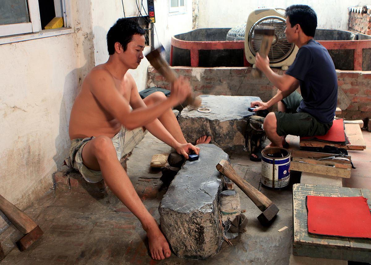 Những người thợ Kiêu Kỵ đang thực hiện công đoạn đập diệp. |