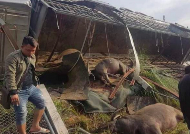 Lật xe tải trên cao tốc, hơn chục con trâu chết và thất lạc