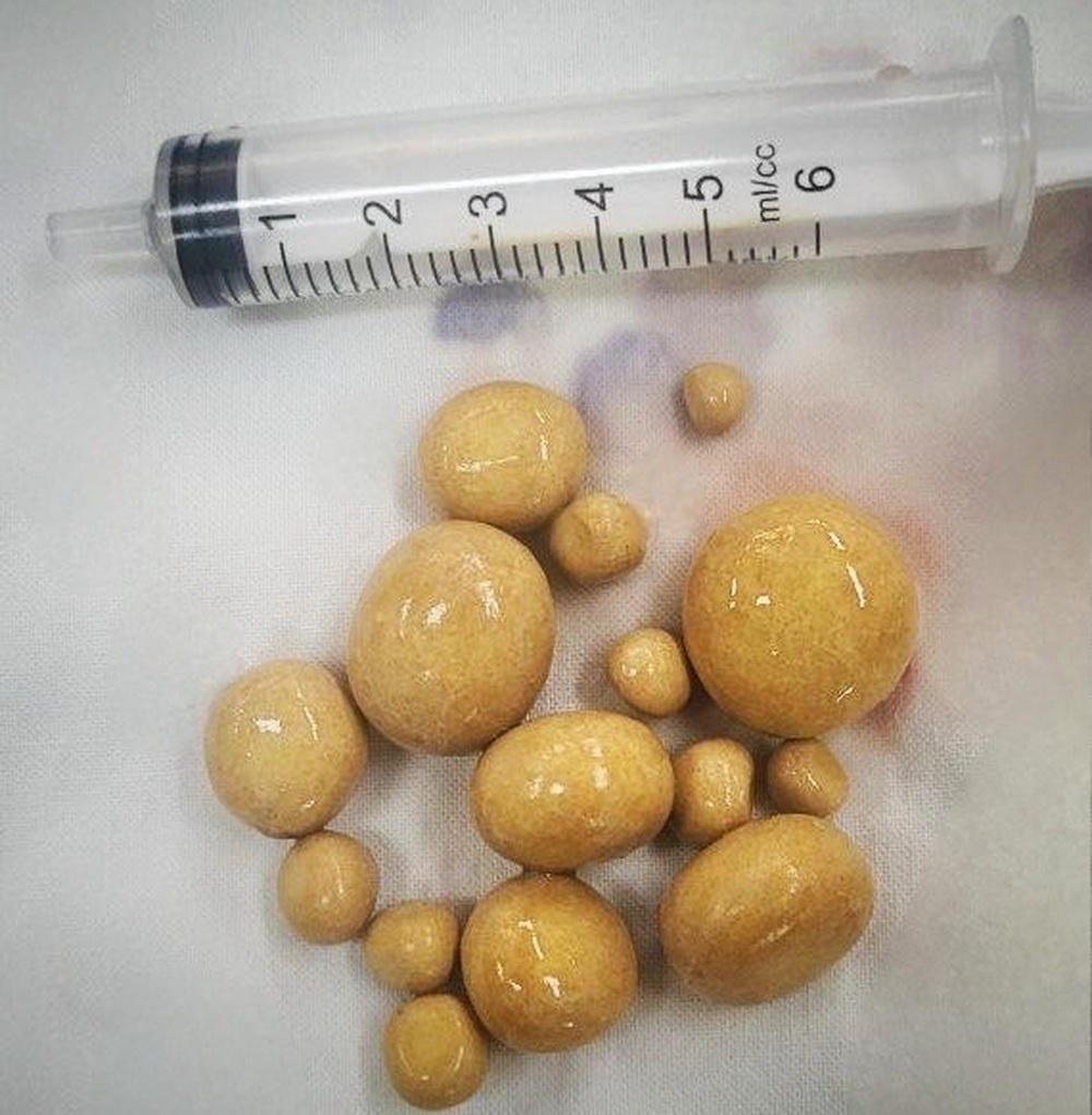 Nhiều viên sỏi có kích thước lớn sau khi lấy ra khỏi bàng quang của bệnh nhân Trần H. |