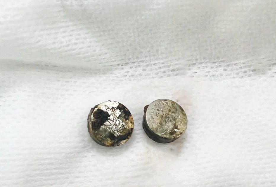 2 cục pin cháy khét được gặp từ bên trong mũi của bé gái N.T.C.L. |