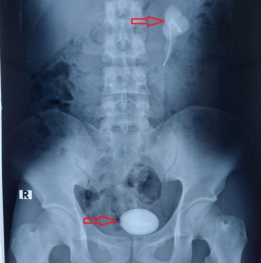 Hình ảnh sỏi thận trái và bàng quang còn 1 ống JJ (trái) Ảnh: BVCC |