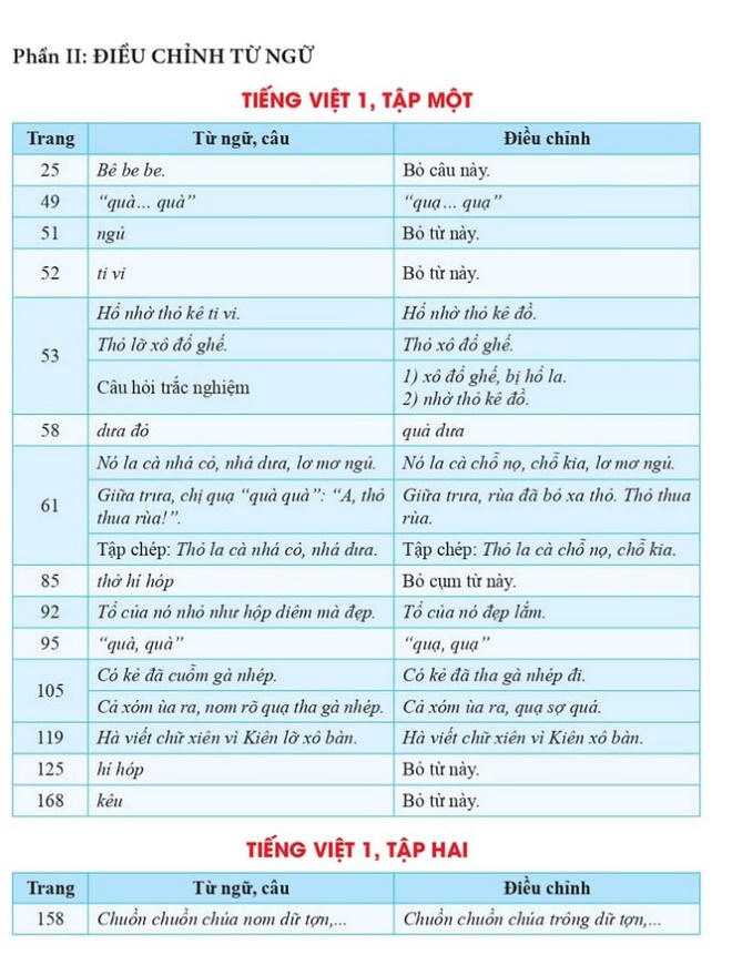 Trong phần tài liệu điều chỉnh, NXB đưa ra 11 bài đọc bổ sung cho 11 bài bị cho là không phù hợp, được Bộ GD&ĐT yêu cầu chỉnh sửa bổ sung, cùng nhiều điều chỉnh liên quan đến từ ngữ trong các bài học.