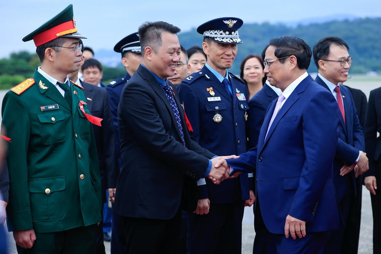 Cục trưởng Cục Lễ tân, Bộ Ngoại giao Hàn Quốc và Đại sứ Việt Nam tại Hàn Quốc lên tận máy bay đón mời Thủ tướng Chính phủ và Phu nhân. Bộ trưởng Bộ Doanh nghiệp vừa và nhỏ và khởi nghiệp Hàn Quốc chào đón Thủ tướng Chính phủ và Phu nhân tại chân cầu thang máy bay.