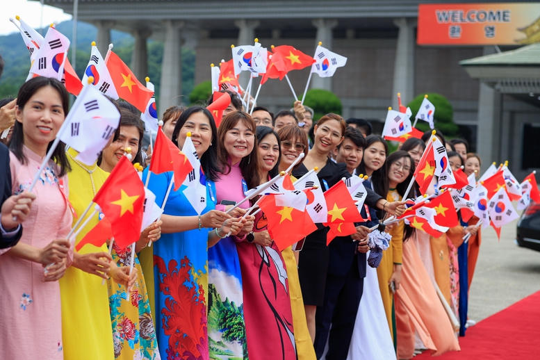 Cán bộ, nhân viên Đại sứ quán và cộng đồng người Việt Nam tại Hàn Quốc nồng nhiệt chào đón Thủ tướng và Phu nhân, cùng Đoàn đại biểu Việt Nam - Ảnh: VGP/Nhật Bắc