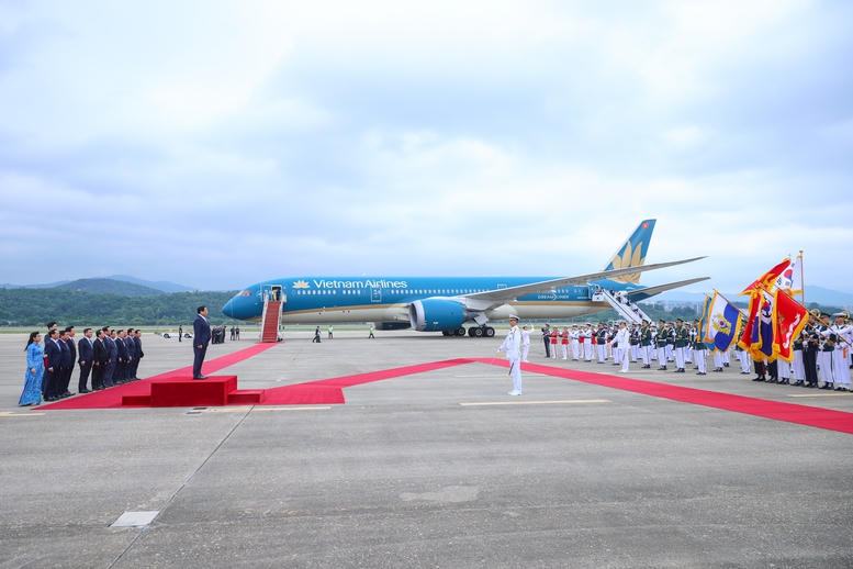 Lễ đón chính thức Thủ tướng Chính phủ Phạm Minh Chính và Phu nhân cùng Đoàn đại biểu Việt Nam được tổ chức trang trọng tại sân bay quân sự Seongnam.