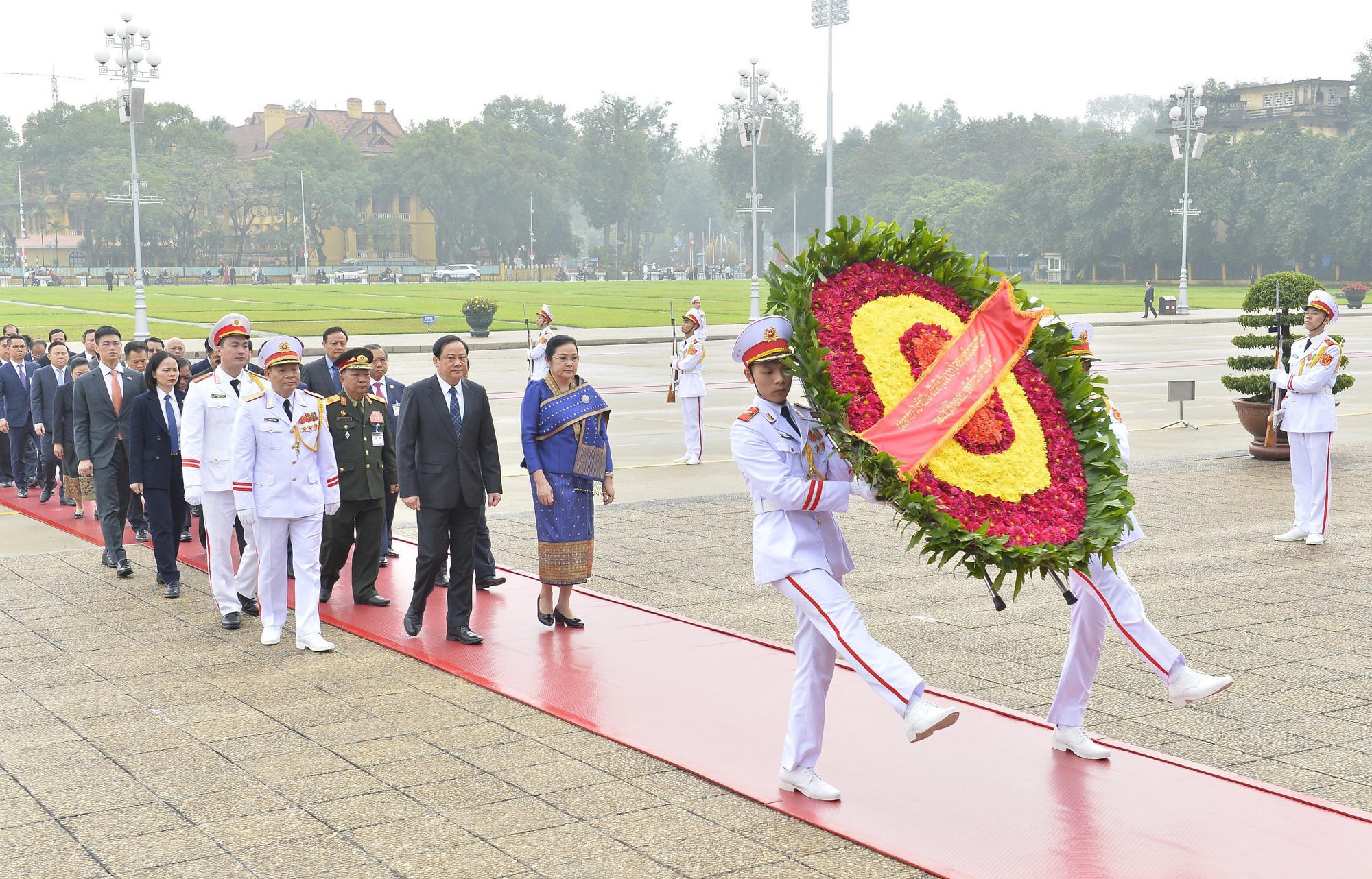 Thủ tướng Lào Sonexay Siphandone và Phu nhân cùng đoàn đại biểu Chính phủ Lào đặt hoa và vào Lăng viếng Chủ tịch Hồ Chí Minh - Ảnh: VGP/Nhật Bắc