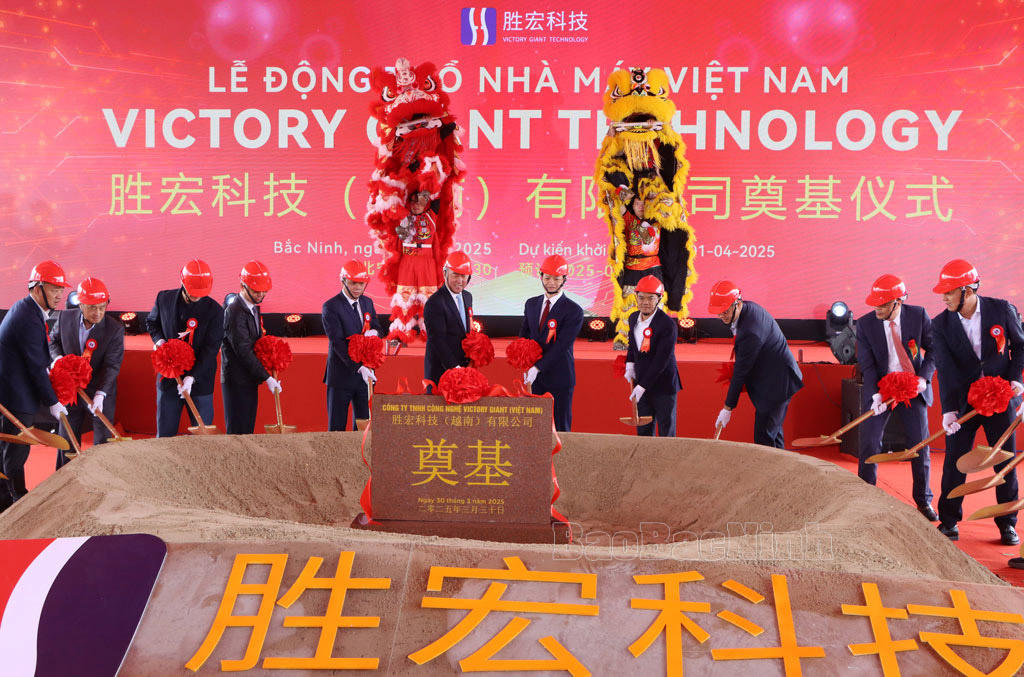Các đại biểu thực hiện nghi thức động thổ Nhà máy Việt Nam Victory Giant Technology. (ảnh Báo Bắc Ninh) |